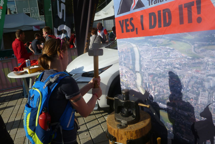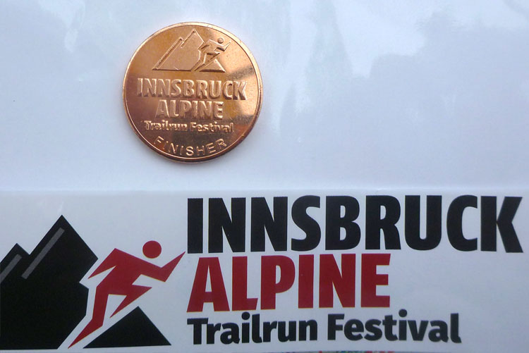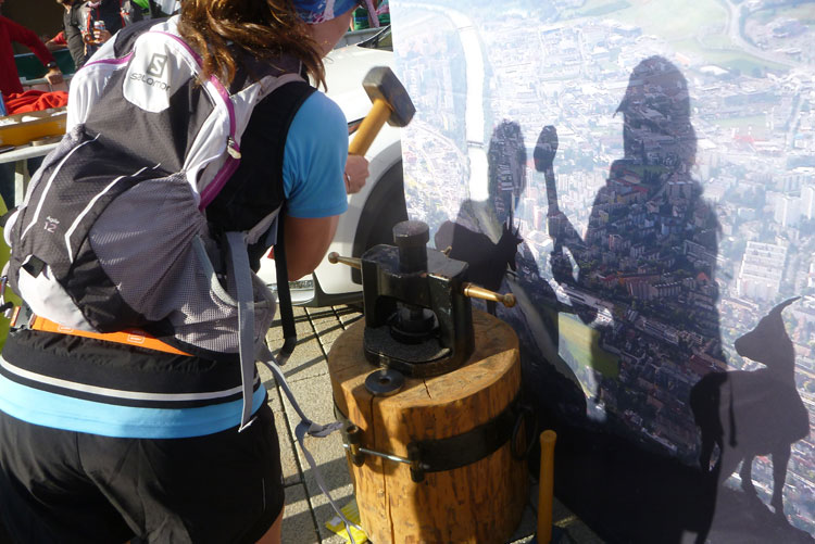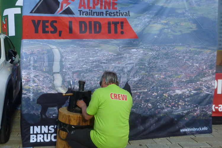 Medaillen gibt es beim IATF nicht, aber vor der Bühne kann sich jeder sein Finisher-Geschenk in Form einer Kupfermünze mit geprägtem Veranstalterlogo selber klopfen. Ob die Vorrichtung dafür von der Alten Münze aus Hall in Tirol kommt? Ich könnte es mir gut vorstellen und würde natürlich optimal passen.