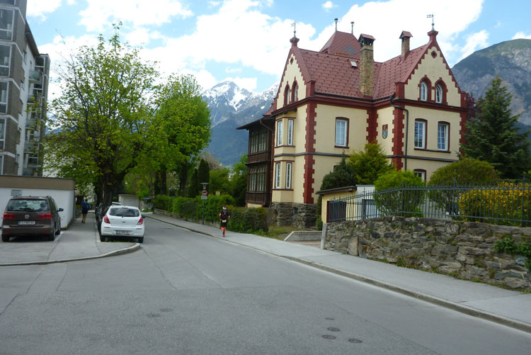 Beinahe zwei Kilometer dauert die beeindruckende Führung durch die Altstadt, dann wird’s wieder „normal“. Wir müssen durch das gesamte Inntal, um wieder zur Nordkette zu gelangen, wo unsere Tour am Morgen begann. Die komplette Durchquerung zieht sich über 4 km hin, wobei es doch meistens leicht bergauf geht. So sind wir praktisch bereits mittendrin in der 4. Bergetappe. Mittlerweile sind die Teilnehmer des K85, K65 und K42 beieinander, gut zu erkennen an den unterschiedlichen Farben der Startnummern. Um 16:30 Uhr wird zudem noch die kürzeste Distanz, der K15 Rookie-Trailrun in der Altstatt von Hall gestartet.