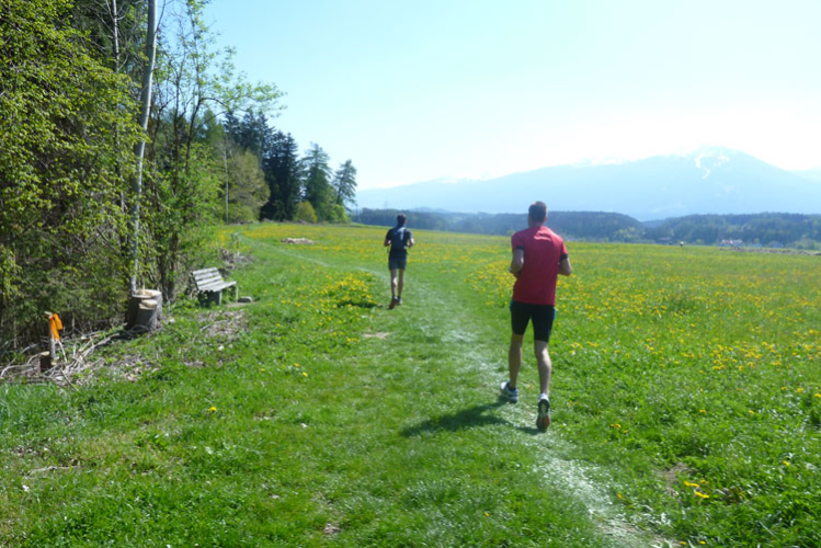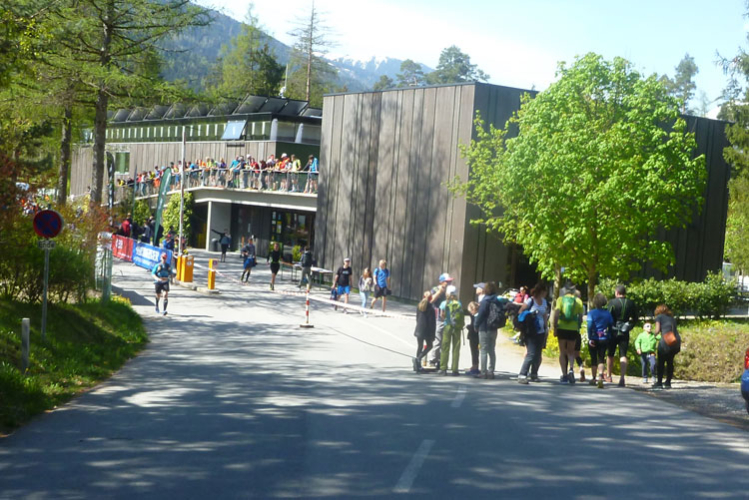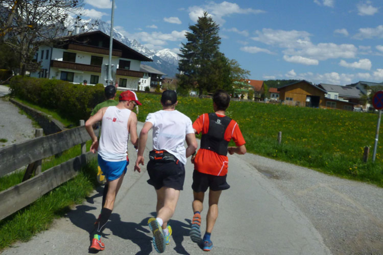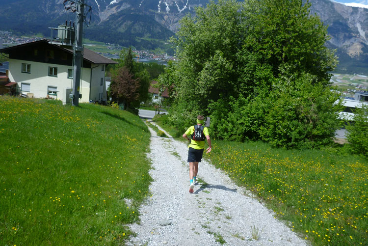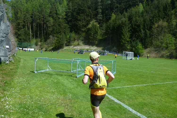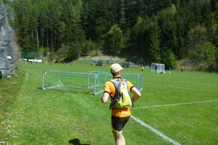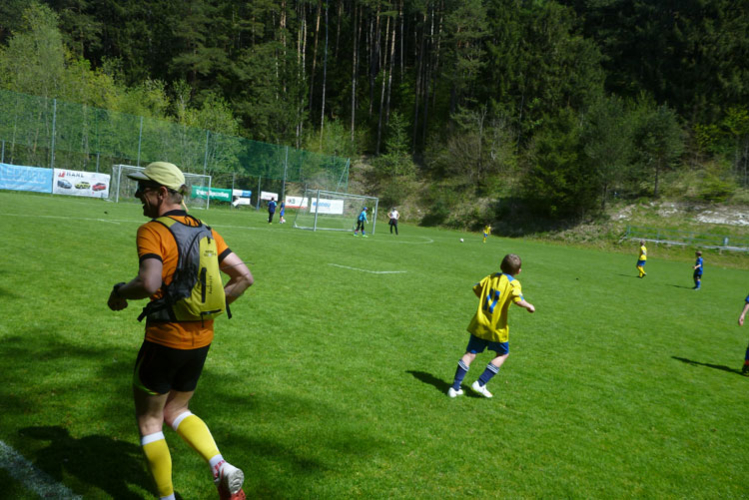 Kurz vor dem Fairways des Golfclub Innsbruck-Igls werde ich vom Führenden des K42 überholt. Dann geht’s wieder, meist in offenem Geländer, runter vom Berg. Ab Aldrans füllt sich dann auch endlich wieder unsere Laufstrecke, die schnellen Marathonis werden mehr und mehr. Nach dem Ortsdurchlauf geht’s an der Seitenlinie, oder auch mal etwas im Spielfeld wegen Platzmangel durch das Jugendspiel des SV Aldrans. Finde ich witzig. Am Ortseingang von Ampass stehen 42 km auf dem Tacho.