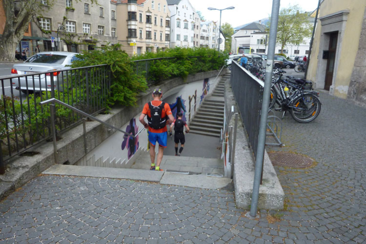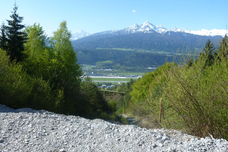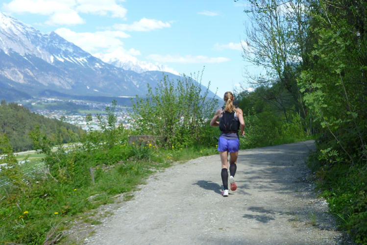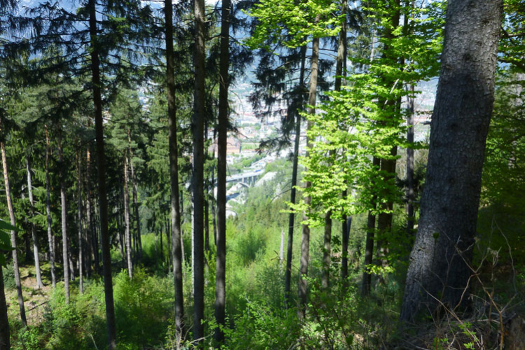 Ein geschotterter Weg führt uns auf den höchsten Punktes der 4. Bergbesteigung. Steil geht es hinunter nach Innsbruck. Die finalen drei Kilometer wechseln sich in ihrer Beschaffenheit mit Schotter, Waldwegen, Trails und Teerstraßen schön ab. Kurz unterhalb der Bergstation der Hungerburgbahn passieren wir noch das denkmalgeschützte Stampfbeton-Viadukt der alten Bergbahn und treffen wieder auf den Abschnitt, den es heute Morgen rauf ging. Über Alpenzoo, Innsteg und am Rennweg entlang geht es ins Ziel in die Trailcity.