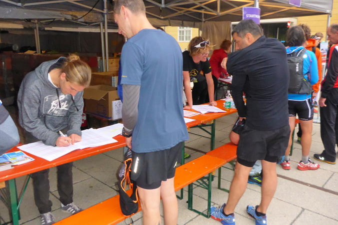 Als wir gegen 19 Uhr eintreffen, ist noch nicht viel los. Bevor man seine Startnummer erhält, wird die Pflichtausrüstung für den Nighttrail kontrolliert: Ausweis und Krankenversicherungskarte, Trailschuhe und Stirnlampe. Angemessene Kleidung ist ebenfalls Pflicht, wobei dies wohl eher dem persönlichen Empfinden überlassen wird. Trotz angesagtem Regen sehe ich viele in kurzen Hosen und Shirts.