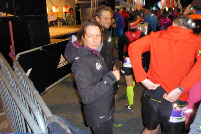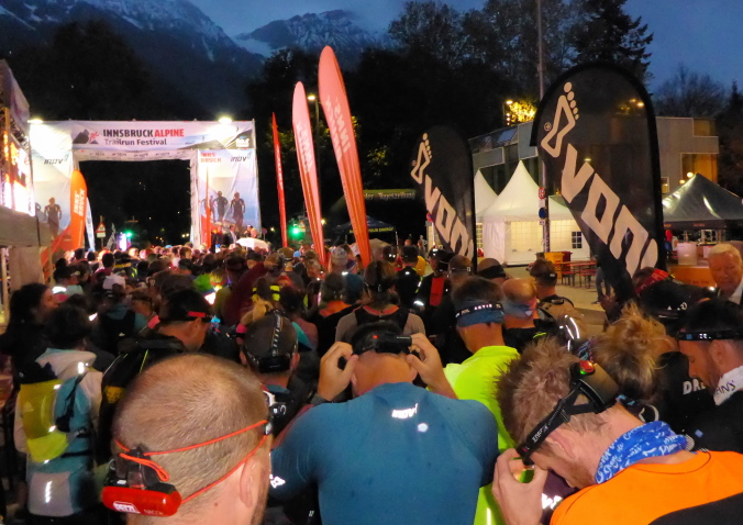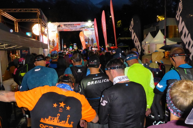Es beginnt zu tröpfeln und so ziehen Norbert und ich uns in die Kongresshalle zurück, Laura ist als Zuschauerin ebenfalls dabei. Um 20Uhr15, es ist schon recht dunkel, begeben wir uns zum Startbereich, wo sich bereits eine Menschentraube gebildet hat. Die Pflichtausrüstung, vor allem die Funktion der Stirnlampe, wird nochmals überprüft, bevor wir den Startbereich betreten dürfen.