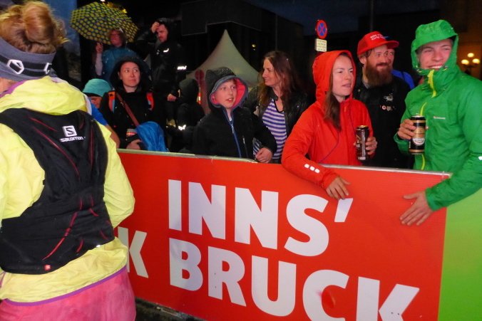 Ich spüre, dass mir der Anstieg keine Schwierigkeiten bereitet und genieße daher die kurzen Ausblicke auf das beleuchtete Innsbruck unter uns. Plötzlich geht es den Berg runter und ich lasse es laufen. Unten bittet mich der Streckenposten erneut bergauf.