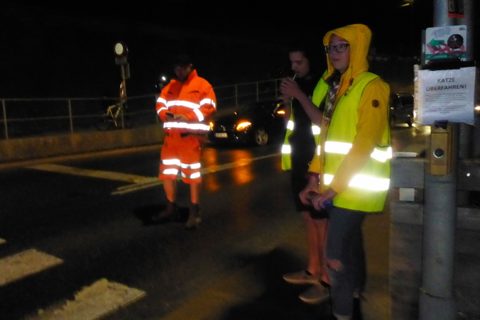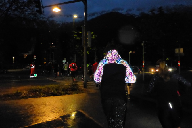 Zunächst geht es durch einen kleinen Park, dann über die von Helfern gesperrte Straße auf den Gehweg oberhalb des Inn entlang. Es ist noch relativ hell und von Straßenlaternen beleuchtet. Links führt uns eine überdachte Holzbrücke für Fußgänger über den Fluss. Auf der anderen Seite laufen wir einige Stufen nach oben und erneut über eine von Helfern gesicherte Straße.