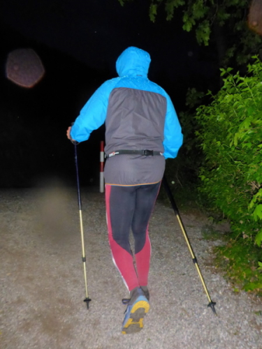 Der Weg wird nun schmaler, plötzlich geht es eine steile Böschung hinauf. Der Regen, der zwischenzeitlich aufgehört hatte, setzt jetzt wieder ein. Ich bin warmgelaufen, deshalb macht es mir nichts mehr aus. Wir gehen ein schmalen weichen Pfad hinauf. Ich könnte auch laufen, will aber meine Kraft für Samstag aufsparen. Vor und hinter uns sind als Lichtpunkte der Mitläufer zu erkennen. Norbert und ich laufen zusammen.