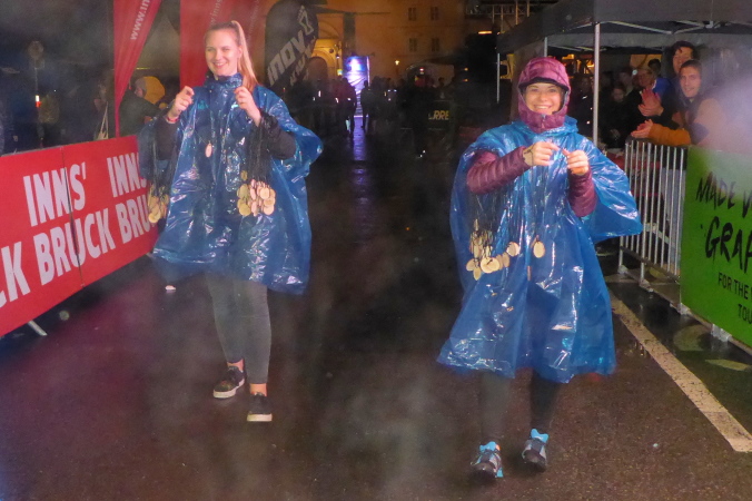 Weil wir aber noch Kraft in den Beinen haben, kommen wir letztlich gut hinunter. Nun stehen wieder an allen Abzweigen Helfer, die uns sicher durch die Dunkelheit nach unten geleiten. An der Straße angekommen, ist die Wegweisung wieder eindeutig und gleich kommt der hell erleuchtete Theaterplatz in Sicht. Es gibt eine originelle Medaille aus Holz, und eine kleine Zielverpflegung mit Wasser, Obst und Glückwünschen der Helfer.