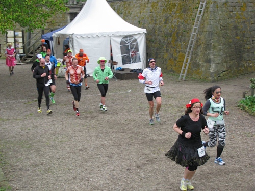 Nun ja, meinen Kampfgeist hatte ich zwar vor einigen Runden neu entfachen können, aber die Bratwurst-Attacke saß noch tief. Verstohlen blickte ich zum mampfenden Peter rüber. Just in diesem Augenblick lief Cabanaut Captain Jack alias Milos Mihailovic an mir vorbei, und ich musste grinsen. "Nun weiß ich endlich, was das Geheimnis der Caba´s ist: Zieh Dich kostümiert an, und du erstickst jeglichen mentalen Tiefpunkt im Keim" Ich hängte mich an den Piraten dran und es ging weiter. Am voll verspiegelten Glashaus vorbei laufend fragte ich innerlich gelangweilt, wer der schönste im ganzen Land sei. Ein Millisekunden-Gedanke huschte vorbei, antwortete: "Geh aus dem Bild, du fette Sau, ich seh nix..."