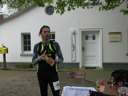 Er fuhr fort: "...aber wir küren ja nicht nur den schnellsten Mann, sondern auch die flinkeste Frau. Gabi Winck ist als Achtplatzierte mit 3:48:35 ins Ziel gelaufen. Kommst Du bitte nach vorn, Gabi?", grinste er und überreichte diesen in beharrlicher Handarbeit gefertigten Preis der staunenden Gabi.