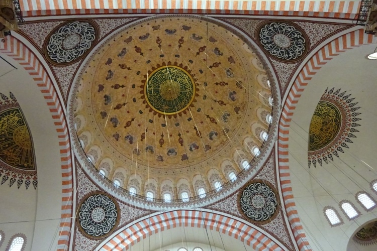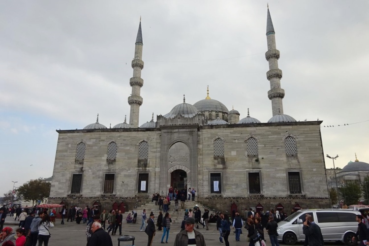 Es ist bereits 14 Uhr 30, als wir wieder am Kai an der Galatabrücke anlegen. Für den Nachmittag habe ich einen Besuch der Mitte des 16. Jahrhunderts gebauten Süleymaniye-Moschee eingeplant. Mit einer weitläufigen Gartenanlage ist sie eine der größten in Istanbul. Wie gestern im Sultanahmet-Viertel mit der Hagia Sophia und der Blauen Moschee sind auch hier viele Touristen anzutreffen. Der Aufpasser hält mich für einen Moslem, der zum Gebet hineingehen will. Ich ziehe zwar die Schuhe aus, aber wickle mir die zum Transportieren der Schuhe verfügbaren Plastiksäcke um die Socken – und trage meine Sportschuhe offen hinein. Teppichböden in derartigen Gebäuden haben einen besonderen Geruch. Der Aufseher, vorher mit einem betagten und gläubigen Muslim in ein Gespräch verwickelt, kommt nun hinein und sieht mich fotografieren, anstatt tief gebeugt Dankesworte in Richtung Mekka auszustoßen. Ich murmele „Salam“, und ein „Allahu akbar“, aber seine Arabischkenntnisse scheinen schlecht zu sein. Auf Türkisch schimpfend fischt er mich raus und zeigt mir den Ausgang. Wenigstens war ich wieder einmal in einer Moschee, die Besucherzeiten für Nichtmuslime sind nämlich sehr begrenzt.