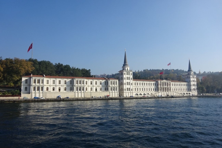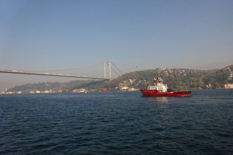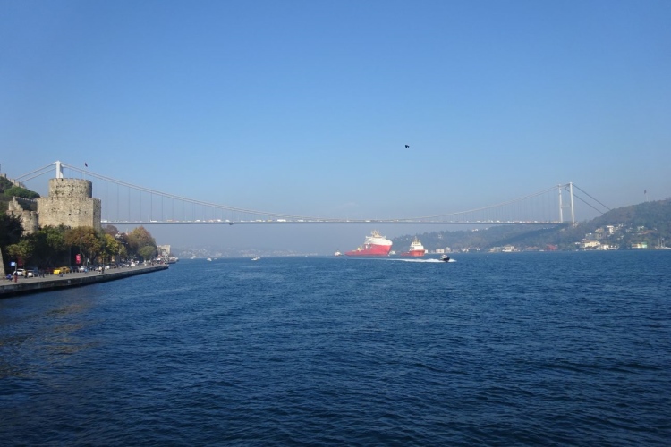 Ich hatte bisher immer angenommen, dass die Bosporusbrücke die engste Stelle zwischen Asien und Europa sei – doch je näher wir uns der Sultan Mehmet-Brücke nähern, an deren linken Ufer sich die Rumeli-Festung befindet, desto mehr bezweifle ich dies. Mit bloßen Augen kann man erkennen, dass diese Brücke ein wenig kürzer ist. Aber vielleicht täusche ich mich auch – ich muss demnächst einmal Mr. Google befragen. Unserem Ausflugsboot kommen laufend Frachter entgegen, die vom Schwarzen Meer die Meerenge mit Lotsen passieren und so durch das Marmarameer und die Dardanellen ins Mittelmeer gelangen.