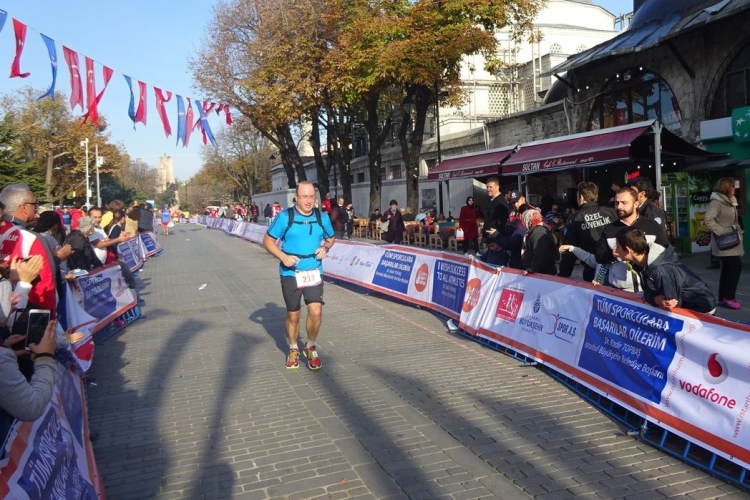 Wieder andere stürmten bei Kilometer 15 davon, jetzt haben sie schlapp gemacht und ihrem Übereifer Tribut gezollt. Ich nehme das gelassen. Auch die, die jetzt bei Kilometer 36 gehen, werden unter 5:30 finishen. Meine Uhr zeigt nach 40,38 Kilometern 4:42 Stunden an, 18 Minuten für zwei Kilometer sind eine Rückversicherung – wenn es nicht den Anstieg auf der Kennedy Caddesi und hinein in den Gülhane-Park gäbe. Hunderte Sonntagsausflügler sind im Park an der Blauen Moschee unterwegs, wir Läufer müssen ausweichen. 500 Meter vor dem Ziel zeigt meine Uhr 4:59 an, eine Zeit unter 5 Stunden geht sich nicht mehr aus. Aus technischen Gründen kommt es immer mehr in Mode, einfach die Einlaufzeiten zu werten, es werden 5:03:02 Stunden.