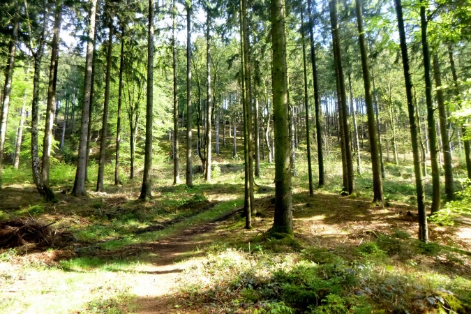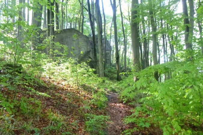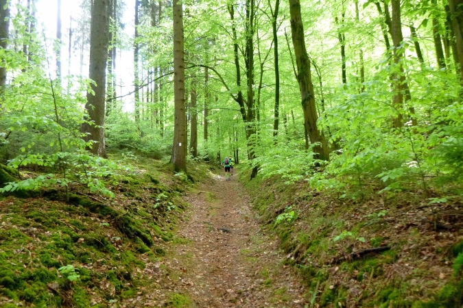 Dann weicht unser Trail vom Weg ab. Man gestatte mir das Wortspiel. Es heißt nämlich offiziell Ith-Hils-Weg, ist eigentlich aber schwer wie ein Steig oder wie ein Trail, wie man heute sagt. Sie untertreiben hier halt gern etwas in ihrer Bescheidenheit. Es könnte doch etwas riskant sein, so dicht an der Kante zu traben. Also schickt uns Detlef unterhalb des Kammweges auf breiten Wegen weiter. Aber nur kurz, dann treffen sich die Pfade und wir gehen (!) auf ziemlich verblockten, steilen Aufundab-Trails weiter. Laufen ist nicht.