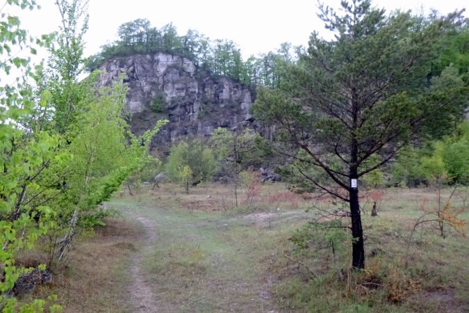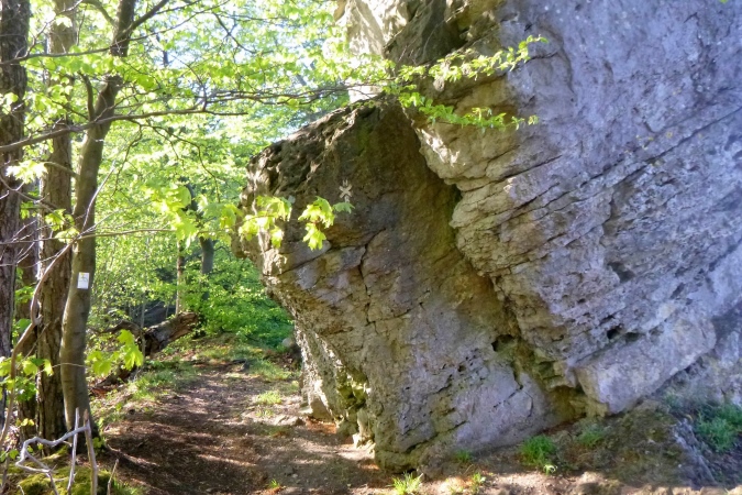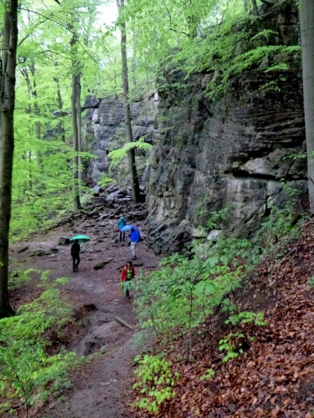 Knapp dahinter geht es auf dem Klippenweg zum Ziel. Es ist ein Steig, wo die Felsen abbrechen. Auf Glitsch und am Stahlseil geht es runter. Gut, dass das Seil mit weichem Kunststoff ummantelt ist, Handschuhe hat ja keiner dabei. Unten aufpassen: das Wanderwegenetz von Salzhemmendorf ist erreicht. Es gibt vele Kreuzungen! Aber zuerst geht es noch durch einen Steinbruch mit sehr imposanten Abbruchkanten.