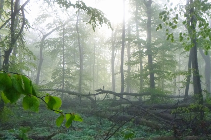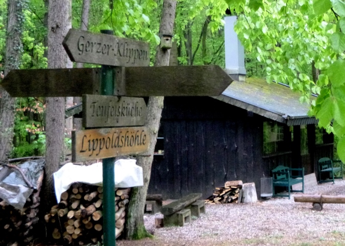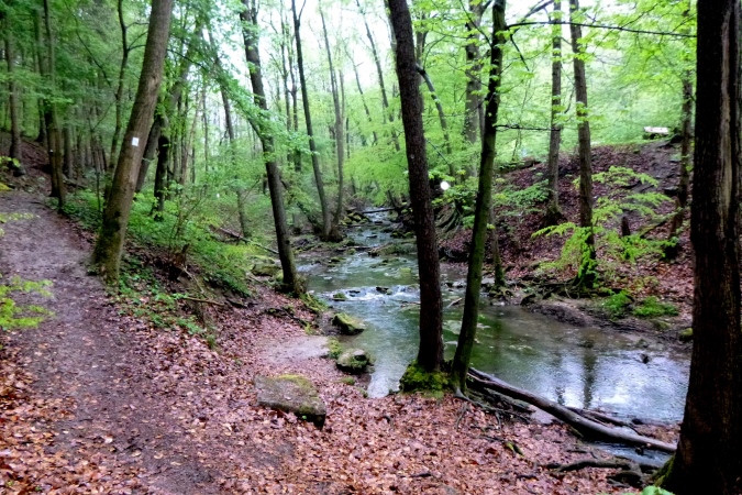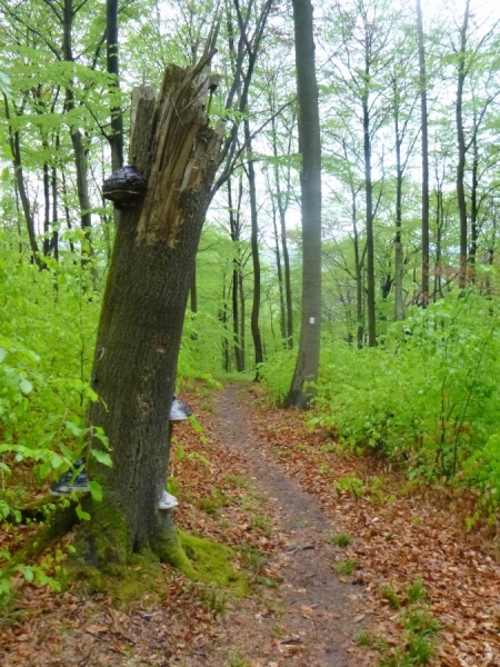 Was man auch immer dort treibt, es hat Zeit für später. Der Duinger Berg ruft. Der ist genauso schmal und langgezogen wie der Ith, läuft genau parallel zu ihm, hat aber eine andere Geologie und Fauna. Und es gibt kein Bärlauch. Aber schön hoch ist er auch. Das Tal der Glene unterbricht ihn. Dort findet man die Lippoldshöhle. Auf sehr schmalem Steg über den Bach, dann gegenüber wieder hoch zu einem schönen Kammweg, der nun im Regen nicht ganz so attraktiv daherkommt. Jedenfalls was die Aussicht betrifft. Auch vom Leineberglandbalkon aus gesehen ist alles diesig, der Brockenblick fällt heute aus. Aber es ist wieder toll zu laufen. Am Ende liegt Marienhagen mit der allerletzten Tanke. Cola und Gummibärchen sind sehr gefragt.