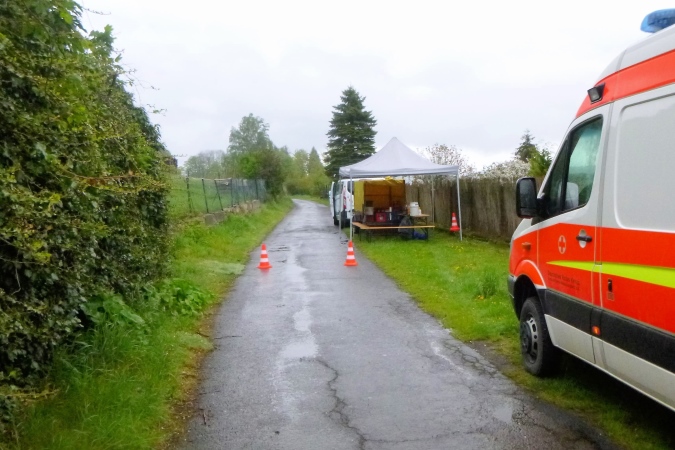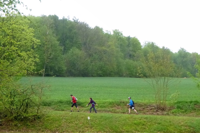 Meistens sind wir im Wald und unter Bäumen. Und das ist auch gut so, denn man hat Schatten bei Sonne und Schutz bei Regen wie heute. Ich habe gerade den VP verlassen und schaue zurück, als ein erster Guss im Tal und über dem Ort niedergeht. Pünktlich, der Wetterbericht hat Recht. Ab jetzt Niesel bis ins Ziel und soo warm ist es nun auch nicht mehr. Also die Regenklamotten ausgepackt. Der Niesel weicht die Böden auf, Schlamm und Glitsch erschweren nun den sicheren Tritt. Die Wege sind wie zuvor hervorragend, erfordern aber nun verschärfte Aufmerksamkeit.
