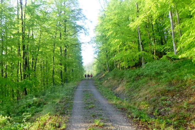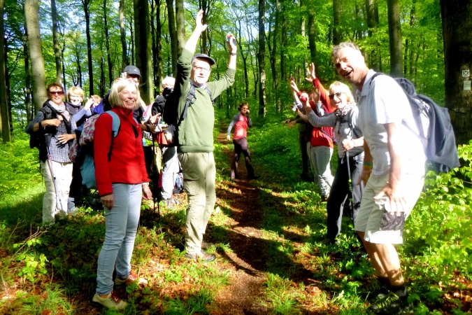 Ein Stück Straße über hügelige Wiesen, am Flugplatz Ith-Wiesen vorbei, dann noch links die Rothesteinhöhle und wir sind bei Holzen. Der Ort wird nur knapp berührt, schon geht’s links auf breitem Weg mitten in den Hils hinein. Und natürlich prompt zum höchsten Gipfel, der Bloßen Zelle, 480 m. Vorher liegen noch zermürbende Anstiege über steile Schotterstraßen und schmale und schlammige Waldpfade vor uns. Etwa 260 HM Anstieg auf 5 km Strecke. Gut machbar, aber noch viel besser läuft’s. als es auf prachtvollen, weichen Wegen da wieder runter geht. Nicht zu schnell, sonst hebt man ab vor lauter Freude. Detlef lauert unten und schießt Fotos. Ihm entkommt niemand. Ich glaube, selten sieht man in so glückliche Läufergesichter.