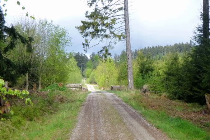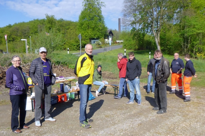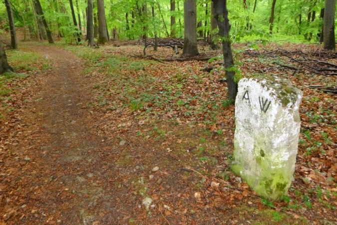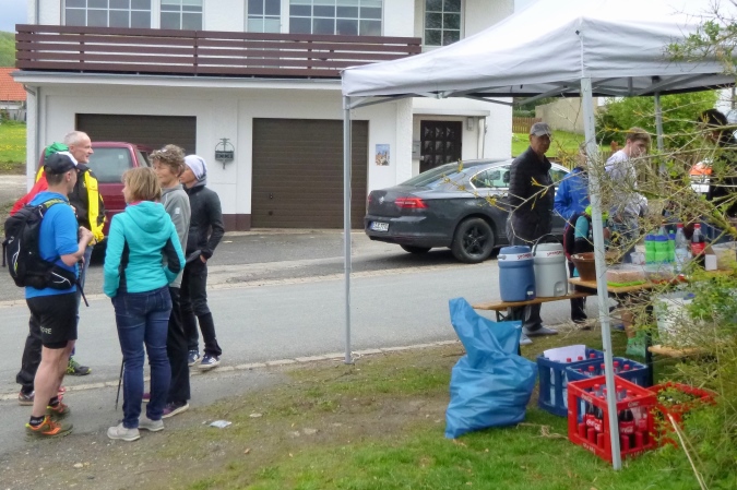 Immerhin ist der Nebel nun weg, das Gras dampft richtig und die Sonne scheint in breiten Strahlen zwischen dem frischen Grün durch. Und noch besser: lange Strecken sind wieder laufbar! Begeisterte Wanderer feuern uns an. Sie machen die Tour in mehreren Etappen. Steinmännchen, alte Grenzsteine mit KH (Königreich Hannover) sind nette Wegmarken. Wenn dann links die ersten Wiesen auftauchen, ist der erste VP erreicht. Also - für diese ersten 30 km hat sich jede, aber wirklich jede Mühe gelohnt!