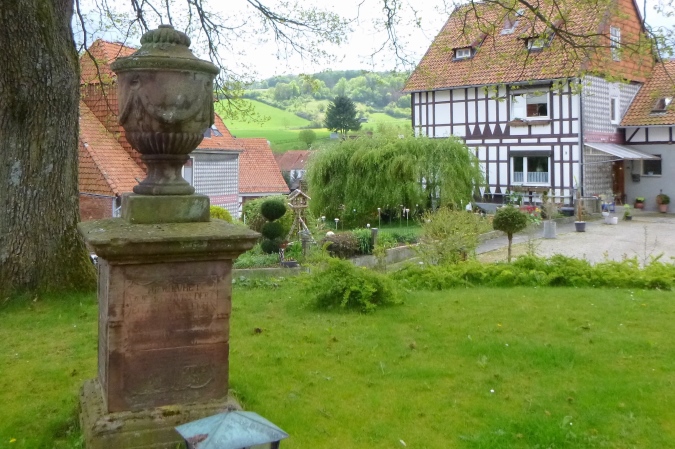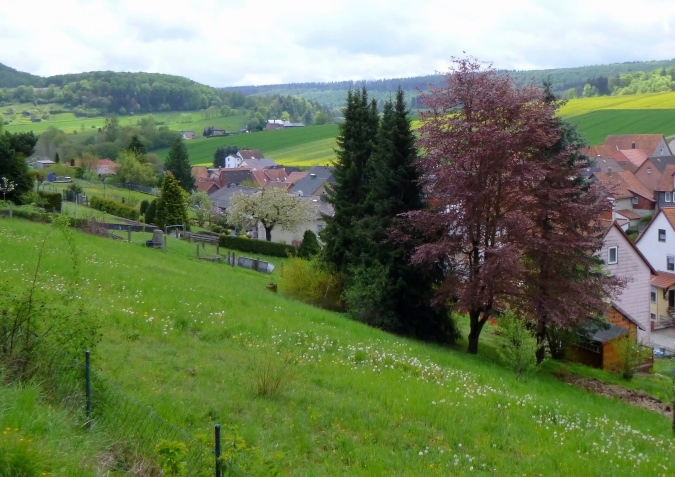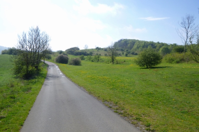 Kaierde heißt der nächste Ort, in einer tiefen Mulde auf halber Strecke nach Delligsen gelegen. Da kann man es schön rollen lassen. Und genau da macht Detlef wieder seine Fotos, bevor wir zum Plattenberg rauf müssen. Ein steiler Weg in den Feldern (der war schon von Weitem zu sehen), lässt dunkle Ahnungen aufsteigen. Und tatsächlich, es geht 120 HM auf knapp 2 km hoch. Aber dann ein Panoramaweg, prächtige Ausblicke nach Norden, und sanftes Gefälle bis nach Delligsen.