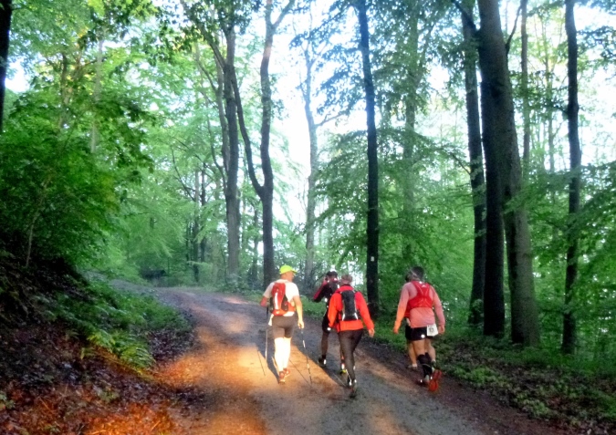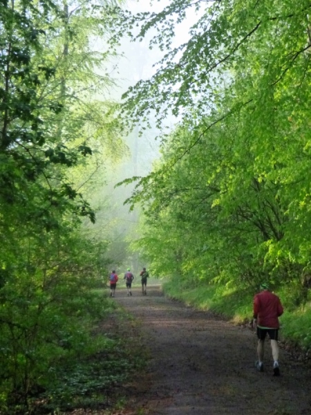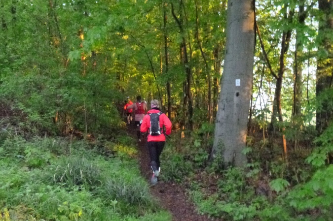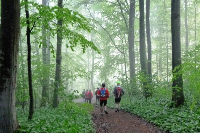 Wir sammeln uns um 5 in Salzhemmendorf in der Therme. Das lässt hoffen für später - Wellness, ihr wisst schon. Wir, das sind die Langsamen. Um 6 starten wir, die Schnellen folgen um 8 nach. Alle sollen nach 81 km und 2100 HM um 20:00 wieder im Ziel sein.10 bis 14 Stunden, so ist der Plan. Nummernausgabe und Briefing, und dann schickt uns Detlef, der Laufcoach, auch running-paule genannt, in die Berge. Ein paar Kilometerchen nur durch die Felder und dann hoch, im Frühtau und bei Sonnenaufgang. So was Herrliches erleben nur wir Frühaufsteher.
