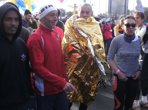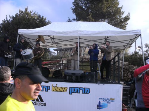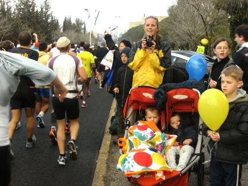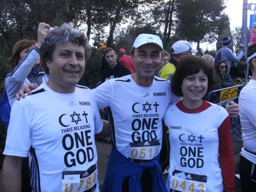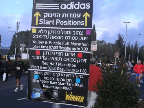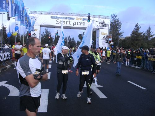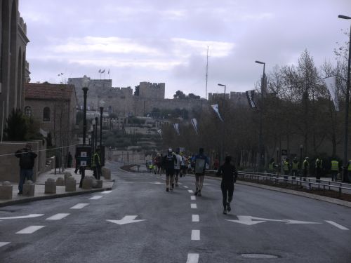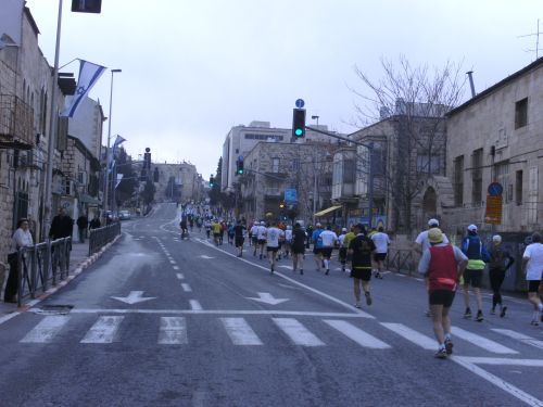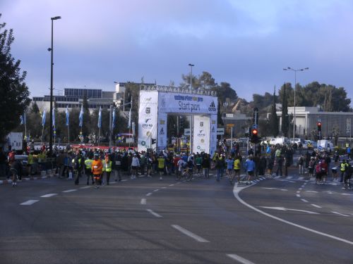 Der Start des Marathons ist morgens um 7 Uhr. Halbe und Zehner sind erst später dran. Zusammen mit anderen Marathonis gehe ich vom Hotel zum Start. Nach 15 Minuten Fußweg sind wir da. Der Start ist unterhalb der Knesset. Man sieht das Parlamentsgebäude oben auf dem Hügel. Es herrscht schon ein buntes Treiben. Ich sehe einige bekannte Gesichter aus Tiberias wieder und höre die verschiedensten Sprachen. Es hat eine angenehme entspannte Atmosphäre. Es ist frisch und der Himmel ist bedeckt. Die höchsten Gebäude der Stadt ragen in den Dunst. Erst später wird teilweise die Sonne heraus kommen. Gottlob weht kein Wind, sonst wäre die Kühle wesentlich stärker zu spüren.