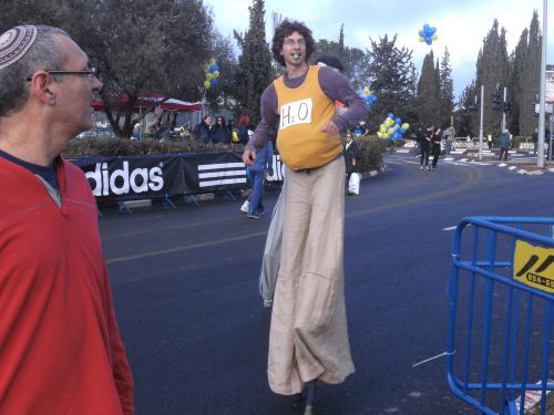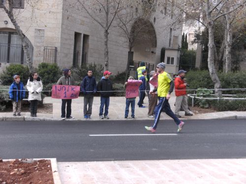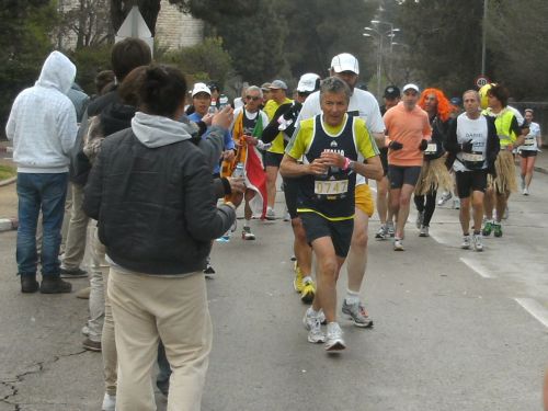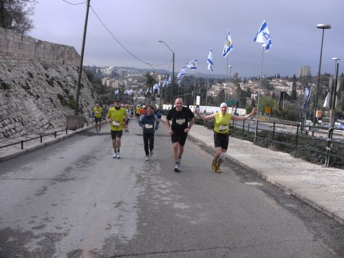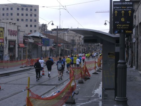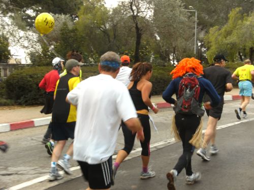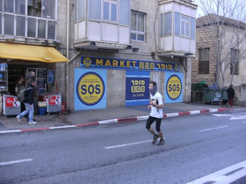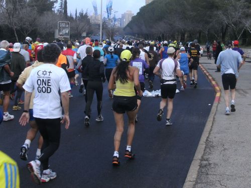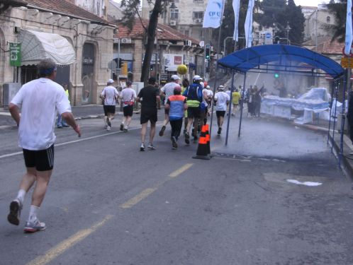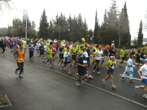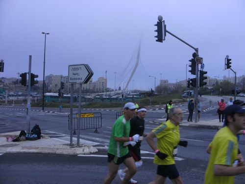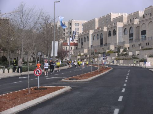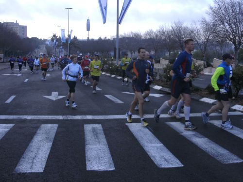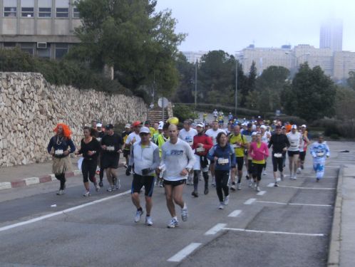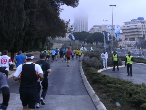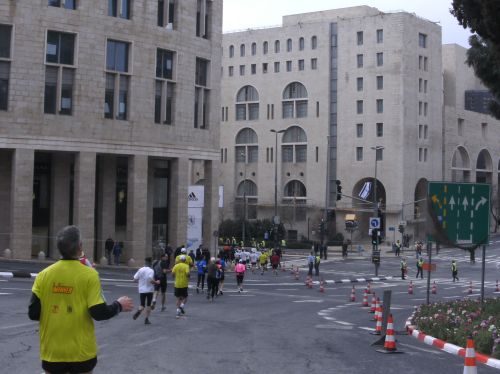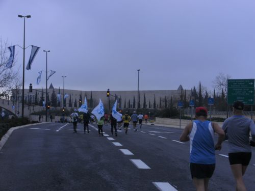 Pünktlich um 7 Uhr gibt der Bürgermeister persönlich den Startschuss zum Marathon. Auf dem breiten Ruppin Boulevard ist genügend Raum und die fast 1.000 Läufer verteilen sich gut. Rechter Hand liegen mehrere Ministerien und das Büro des Premierministers. Zunächst laufen wir in einer Schleife um die Hebräische Universität in Giv'at Ram. Dabei sind schon die ersten Auf und Abs zu bewältigen. Ich ärgere mich über das dunstige Wetter. Kein Fotowetter.