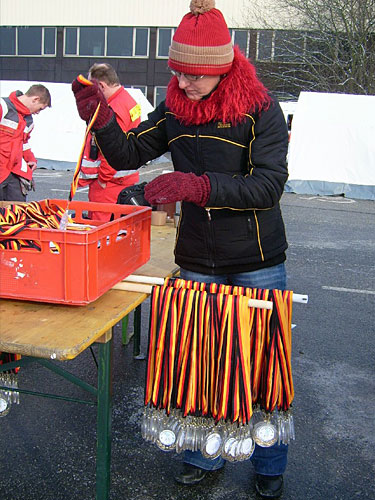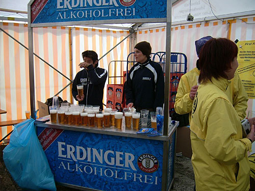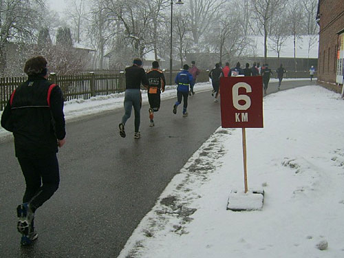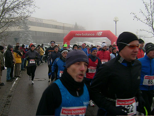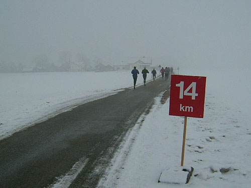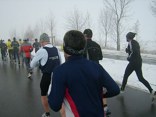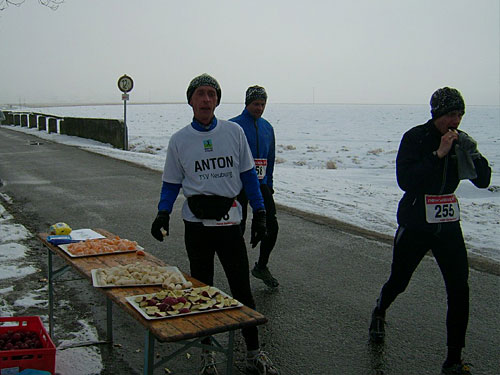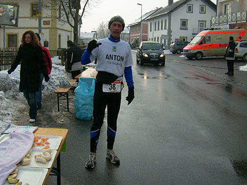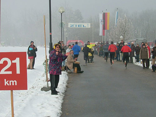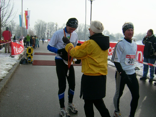Egglfing und die Straßenunterführung und Riedenburg, wo ich noch versuche, einen kleinen Endspurt hinzulegen. Aber da von hinter keine große Gefahr herrscht, genieße ich den Zieleinlauf, wo mir doch die Gaby Schmidtkonz noch mal anfeuert. Und kann noch einen gehenden Gegner überholen. Eine Helferin hängt mir eine schwere Medaille aus Glas um. Als Zeit bleibt dann eine netto 3.24.20 Stunden stehen, womit ich unter den rund 300 Marathonis den 54. Gesamtrang bei den Männern einnehme. Na ja, unter den kalten Bedingungen finde ich die Zeit nicht gerade schlecht, zumal die Marathonsaison noch nicht begonnen hat. Ich rede noch mal kurz mit Gaby, bevor ich ins Verpflegungszelt gehe und mir dort eine Halbe Erdinger und eine Handvoll Schokoriegel hole. Dann kommt ein vollbärtiger Läufer, den die Eisklumpen aus dem Bart hängen. Da wär' fast eine Enteisungsmaschine vom Flugplatz nötig.