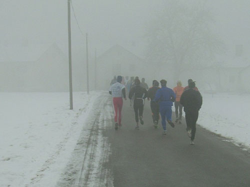 In Egglfing (Kilometer 17) könnten wir den spätgotischen Chor und Turm der Michaelskirche besichtigen. Auch Egglfing ist ein alter Ort, dessen Geschichte weit ins achte Jahrhundert zurückreicht. Unsere Verpflegung ist dagegen nicht steinalt, sondern zweckmäßig für den weiteren Weg, wobei es leichte Probleme mit den Schokoriegeln gibt. Die sind denn angefroren und zerbröseln beim Kauen. Aber mit einem Sturzteetrunk werden die Brösel hinuntergespült. Eine Straßenunterführung folgt und nach einen Kilometer laufen wir nach Riedenburg hinein. Hier gab es das Schloss Riedenburg (erste Erwähnung 1175), das aber 1685 dem Feuer zum Opfer fiel. Leider ist hierzu wenig überliefert. Dafür liefern sich aber die Halbmarathonis wahre Kämpfe, denn der letzte Kilometer ist bereits angebrochen. Auch der Günter Jeblick kommt wieder von hinten und lässt mich in seinem Endspurt stehen.