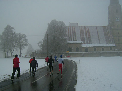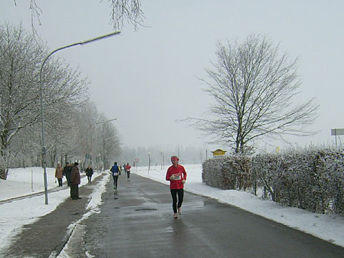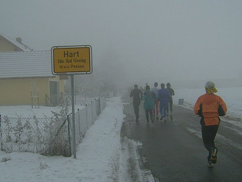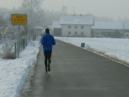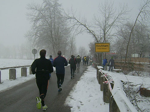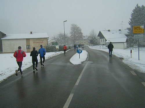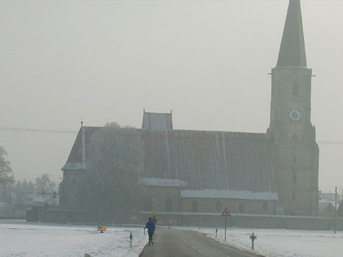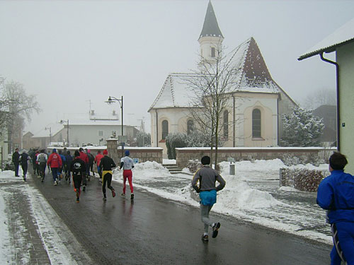 Um 09.50 Uhr versuche ich nach außen zu gelangen. Doch die Läufermenge blockiert die Drehtür, so dass es einige Minuten dauert, durch dieses Hindernis zu kommen. Doch dann geht es unaufhörlich auf 10.00 Uhr zu, unserer Startzeit. Es ist trocken von oben, die Strasse ist salznass, um im Gegensatz zu 2005, wo der Wind uns um unsere Luser gepfiffen hat, relativ windstill. Der Moderator teilt mit, dass es mittlerweile wieder ein Grad wärmer geworden ist. Na ja, mit minus 5,5 Grad wird der Marathon kein Vergnügen werden. Schuss und die eigene Startuhr wird gedrückt. Nach rund 200 Metern laufen wir in einen Kreisverkehr, wo ich bereits meine Digicam ausprobiere. Hoffentlich halten die Batterien. Es geht in den Ortteil Safferstetten. Das ist die Ur-Gemeinde des heutigen Bad Füssing. Im Jahr 735 erstmals urkundlich erwähnt bohrte man in den dreißiger Jahren nach Erdöl, doch lediglich „heilendes“ Thermalwasser wurde gefunden. Das sorgte 1969 für das „Bad“ im Ortsnamen. Doch weiter im Rennverlauf. Nach 1,5 Kilometer laufe ich an der Pfarrkirche vorbei.