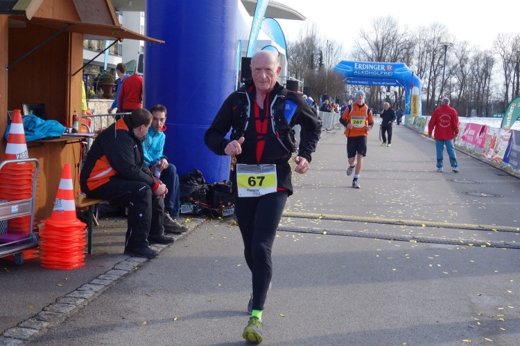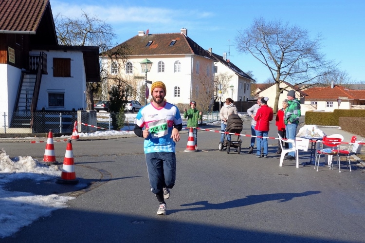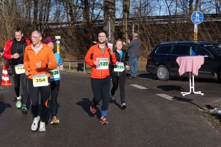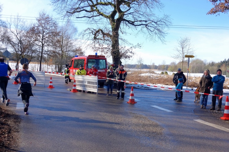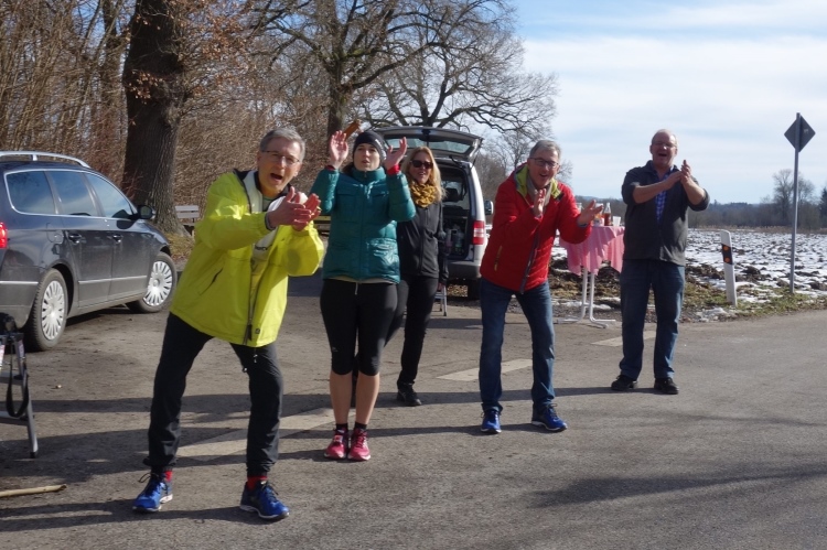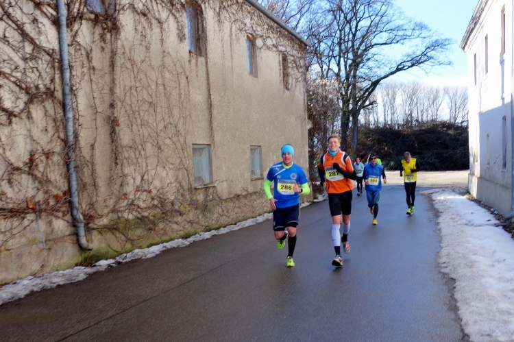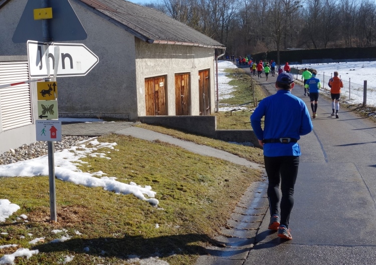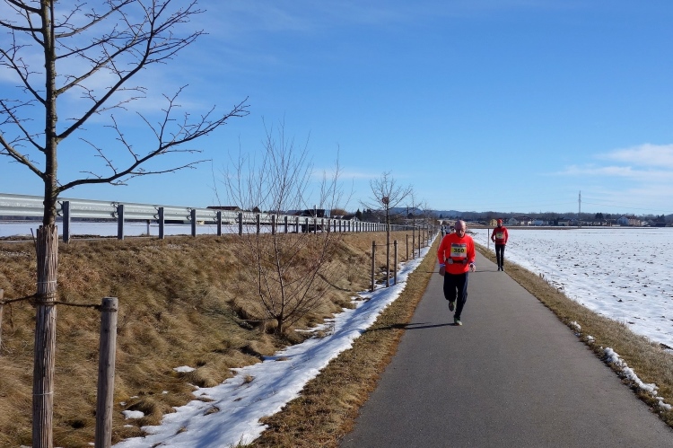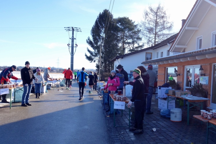 Unter der Hauptstraße hindurch erreichen wir den Actionpoint an der Pichlstaße. Laute Musik und Spaßmacher. Sanft geschwungen mit nur wenigen Metern Höhenunterschied geht es dahin. Links taucht ein zugefrorener Weiher auf. An der Linkskurve eine kleine Kapelle. Bei km 15 / 36 die Verpflegungsstelle des zweiten Rings. Party vor dem Neubau. Der ist immer noch nicht verputzt, dafür gibt es warmes Isogetränk, Tee und allerlei Essbares. Judith habe ich inzwischen eingeholt und ziehe davon.
