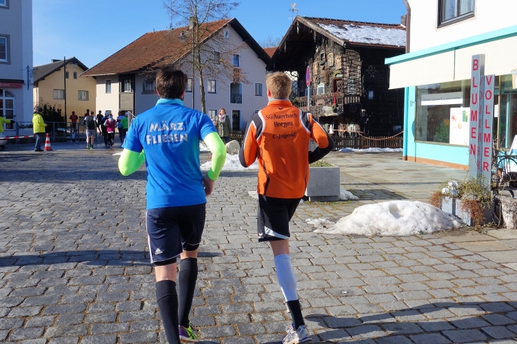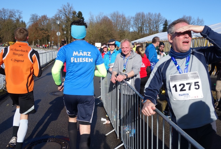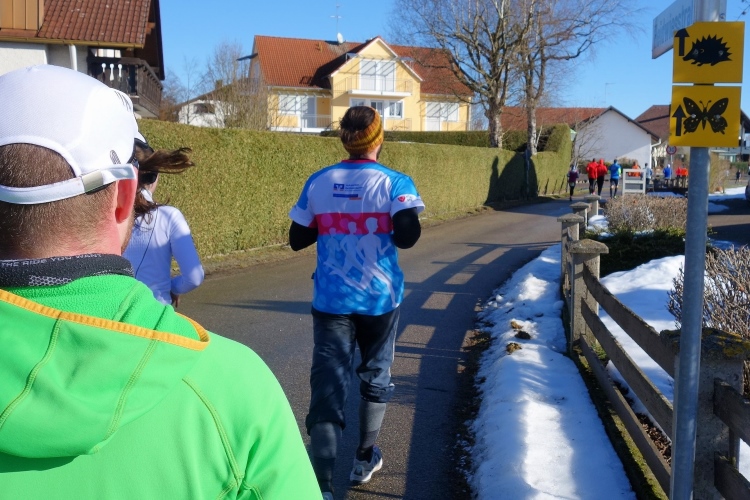 Schließlich kann ich den beiden Herren nicht mehr folgen. „März Fliesen“, für die auf dem blauen Shirt geworben wird, zahlen mir definitv keine Tantiemen für die vielen Fotos. An der Begegnungsstelle überholt mich ein Läuferpärchen im bayerisch weiß-blauen Johannesbad-Laufhemd vom Laufshirtdiscounter. Ich bleibe dran.