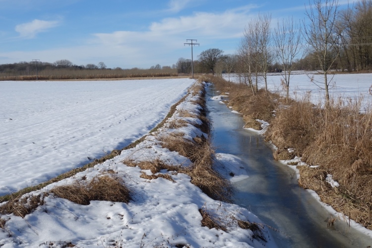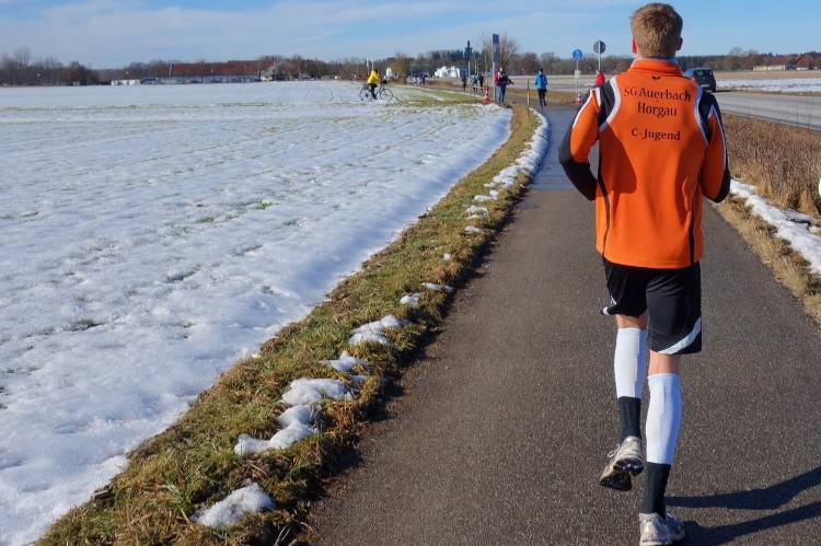 Mich plagt nun die Frage, warum meine Schuhe ein so schlurfendes Geräusch abgeben und wie lange ich dieses Tempo mitgehen kann. Immerhin bin ich bei meinen vorhergehenden drei Marathons auf dem jeweils letzten Viertel furchtbar eingegangen. Ich freue mich auf die Verpflegungsstelle und genehmige mir dort noch mal ein Gel. Danach ziehen die ungemähten Felder auf der rechten Straßenseite meine Aufmerksamkeit an. Sieht schön aus, so im Schnee. Aber wie soll man das fotografieren? Hinüberlaufen scheidet aus: keine Zeit.
