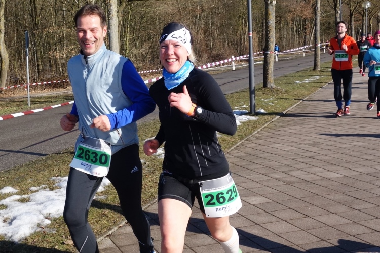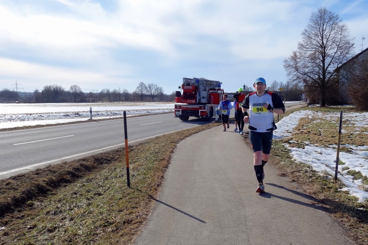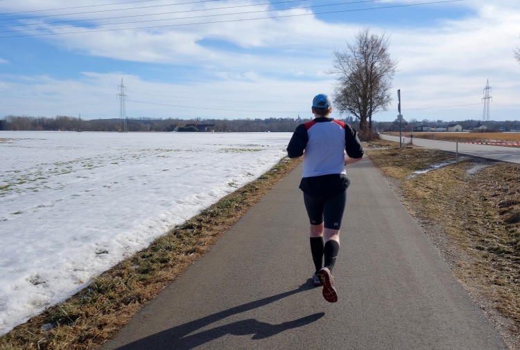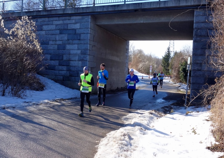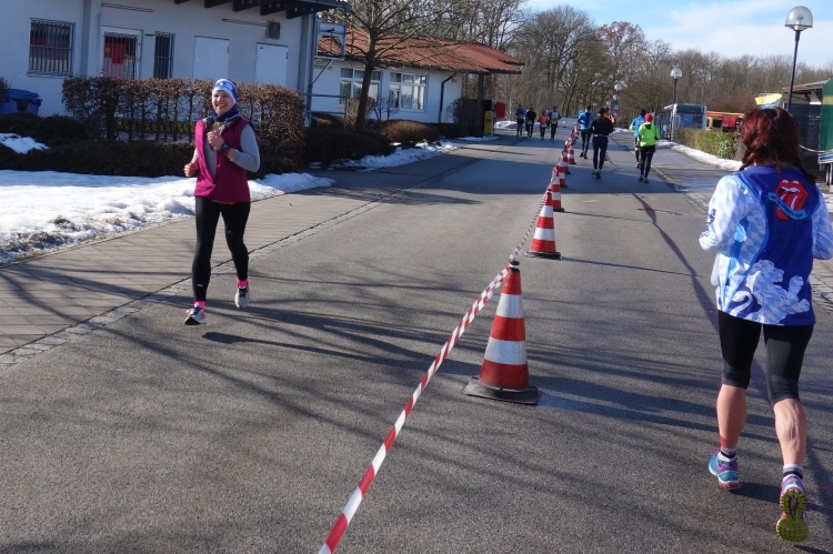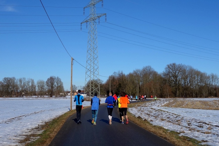 Persönliche Zeitansage durch einen Helfer bei km 35. Noch passt's für eine Zeit unter vier Stunden. Die wunderbare Verpflegungsstelle kostet mich 30 Sekunden. Noch einmal erfreut mich die Sonne auf dem glatten eisigen Schnee auf den Feldern am Wegrand. An der nächsten Kurve kann ich Judith hinter mir erkennen. Sie liegt fast einen Kilometer zurück.