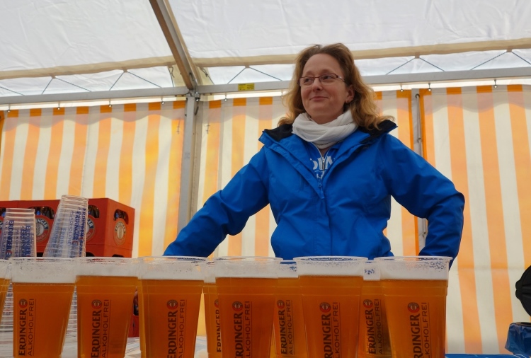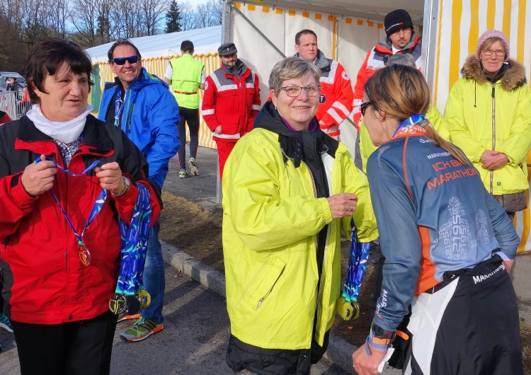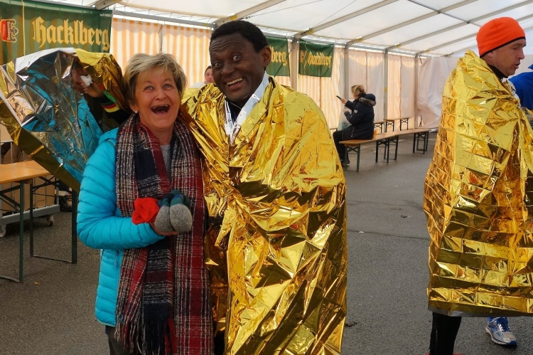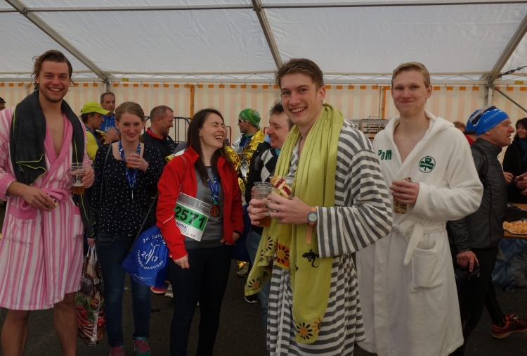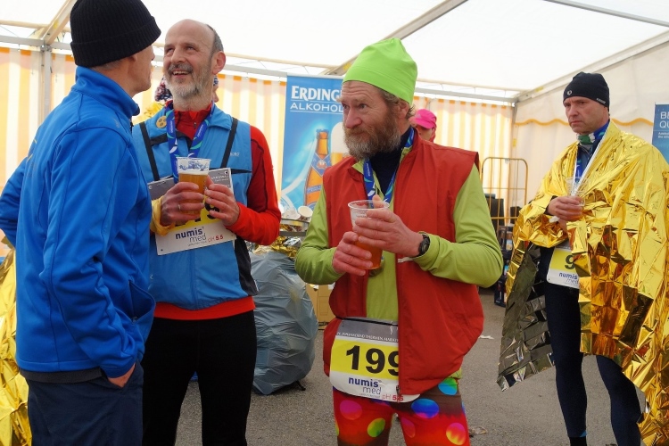 Gute Verpflegung gibt es in den beheizten Zelten am Ziel: alkoholfreies Bier, Iso-Getränke, Obst und Kuchen. Ich liebe Kuchen. Danach treffen wir viele Mitstreiter im Außenbecken des Thermalbads wieder. Ein wunderschöner Abschluss.