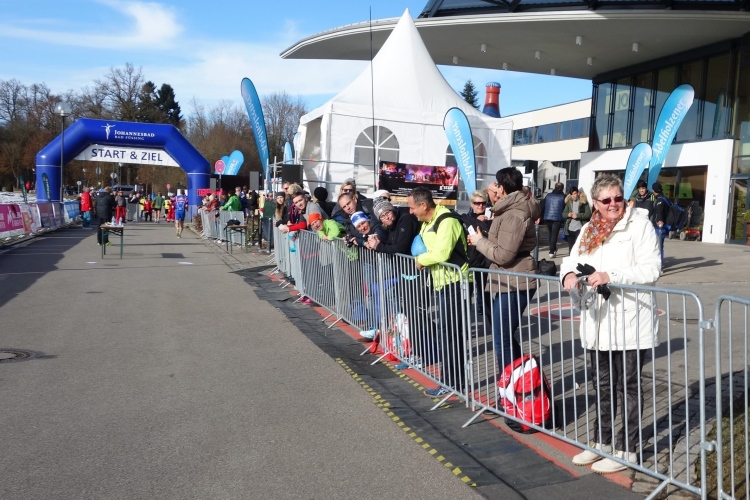 Viele Zuschauer auf dem letzten Kilometer vor dem Johannesbad. Ich genehmige mir eine Tube mit Gel. Wer weiß, wie lange der Vorrat reicht. 11,1 km sind geschafft.