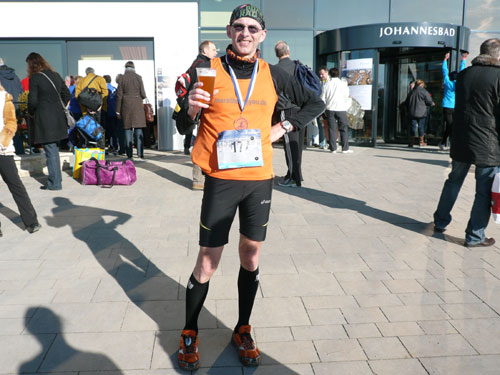 Bis KM 33 habe ich immer Jan in ca. 400 m Abstand vor mir in Sichtweite, aber dann wird es für mich doch zähflüssiger und ich muss noch einige Federn lassen. Aber mit einer passablen Zeit komme ich ins Ziel, wo mir die wunderschöne Glasmedaille überreicht wird. 259 Finisher kann der Marathon in der Liste aufweisen, es gibt aber auch noch den einen oder anderen, der es nicht unter 5 Stunden geschafft hat und so auch nicht im Klassement erscheint. Wenn es was zu meckern gibt, dann sind es diese 5 Stunden Zielzeit. Magic hat es auch wieder unter 3 Std. geschafft, trotz seiner Sprüche hat er wieder Vollgas gegeben und hat mit 2:59 seine Bestzeit nur knapp verfehlt. Gereicht hat das für den 3. Altersklassenplatz und 12. Gesamt.