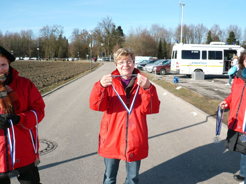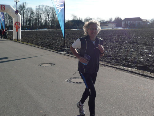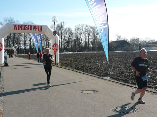 Kurz nach Egglfing unterqueren wir an einer Unterführung die B12, es ist aber auch schon die einzige nennenswerte Steigung der kompletten Runde, daher ist der Lauf auch absolut bestleistungsfähig. Auf dem letzten Kilometer des HMs muss ich Margot nochmals motivieren und ihren Schweinehund einen Schupfer geben. Aber dann ist sie durch mit Maßarbeit. Eine 1:59:58 steht im Ziel auf der Uhr. In ihrer Altersklasse bringt ihr das den zweiten Platz. Ihre Freude ist natürlich riesengroß, aber auch meine.