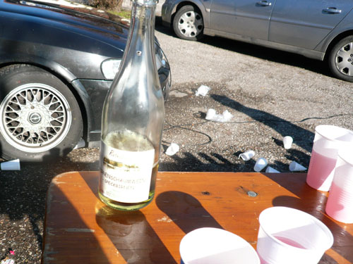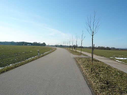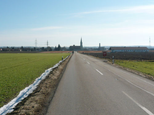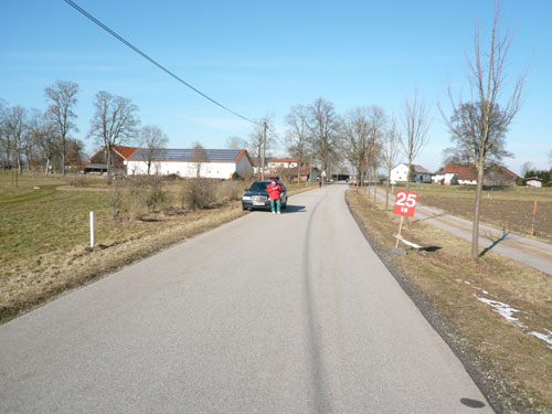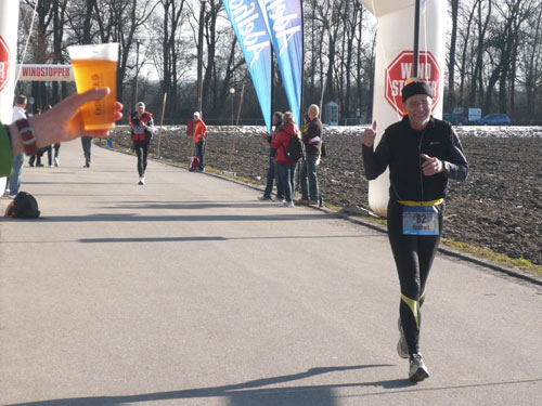 Wieder am Schnittpunkt unserer Achterbahn vor dem Golfplatz hat der Veranstalter zwei Ordner postiert, nicht dass da einer auf dumme Gedanken kommt und 10 km überspringt. Für unseren Zeitnehmer Manne ist es auch ruhig geworden, der steht ein paar Meter weiter und hält die Stellung, um auch den Letzten die 25 km-Durchgangszeit durchzugeben. Kurz danach erreiche ich die Getränkestation in Kirchham. Aber hoppala, was kann mein geschultes Auge da erspähen, der Stationsvorsteher hat sich ein Fläschchen Schaumwein zwischen den Wasserbechern deponiert. Auf meine Anfrage hin lässt er sich nicht lumpen und schenkt mir einen Becher ein. Ist doch gut für den Kreislauf, heißt es.