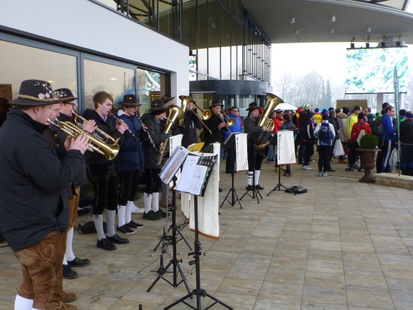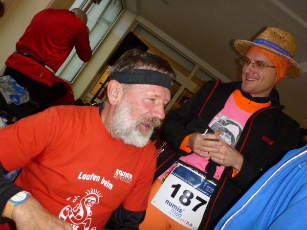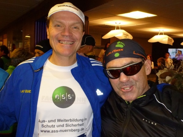 Nach dem Vortrag treffe ich meinen Master (of Disaster) und Cheffe Klaus. „Komm mit, wir gehen Nudel essen, du kannst es für morgen leicht vertragen,“ so motiviert er mich zum Pastamahl im Restaurant des Johannesbads. Platz ist da genug, man hat die normalen Tische und Stühle herausgeschafft und stattdessen Biertische und Bierbänke aufgebaut. Wir sind ja in Bayern und da sitzt man gern länger, wenn man „net hoam mog“. Draußen werden im letzten Sonnenschein die notwendigen Arbeiten am Start und Ziel noch erledigt. Die heutigen Temperaturen von zehn Grad bei Föhn werden wir morgen nicht erleben. Vielleicht bleibt es trocken, aber sicher ist es nicht.