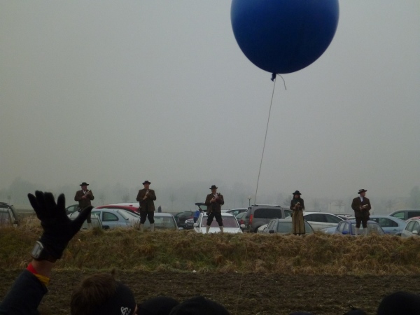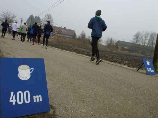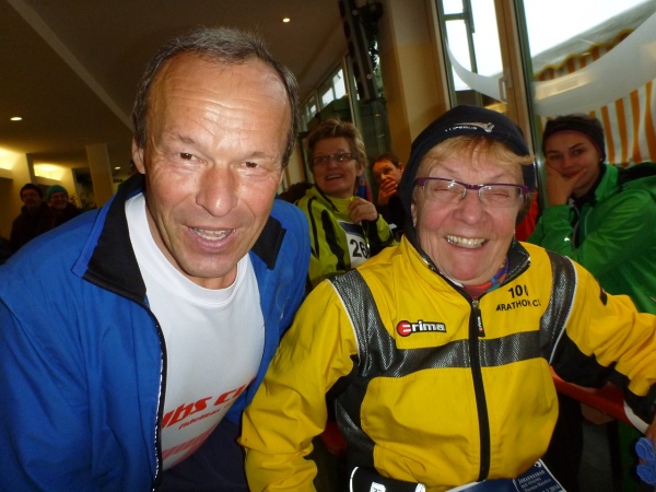 Am nächsten Morgen fahre ich mit meiner Vereinskollegin Henriette von unserer Unterkunft zum Bad. Ein Polizist weist kurzerhand die Automobilisten auf die Grünfläche neben der Straße ein, denn der Parkplatz ist voll. 200 Meter müssen wir zum Bad marschieren. In der Nacht hat es gescheit abgekühlt, der Boden ist angefroren und es nebelt leicht. Einige Sportler laufen sich jetzt, eine Stunde vor unserem Start, schon ein. Ich werde das auf den ersten Kilometern nachholen. Mein Plan für den Marathon, Gemütlichkeit, Ratschen, Fotoschießen und vielleicht mit dem 3.45er Pacer mitlaufen. Übrigens, weitere Zeitläufer sind im Angebot, und die freuen sich, wenn der eine oder andere sich anschließt.
