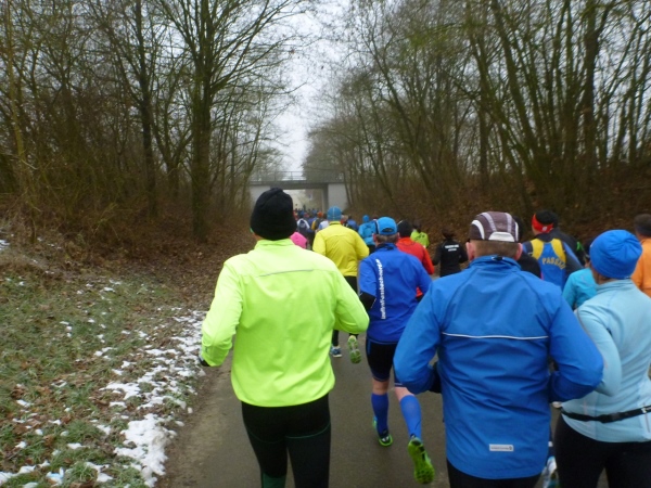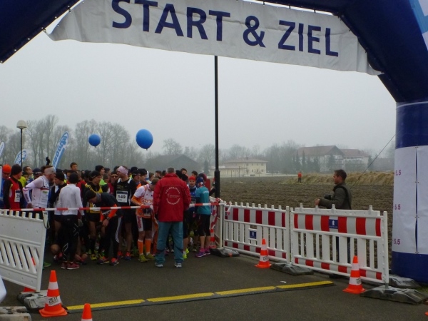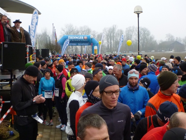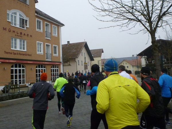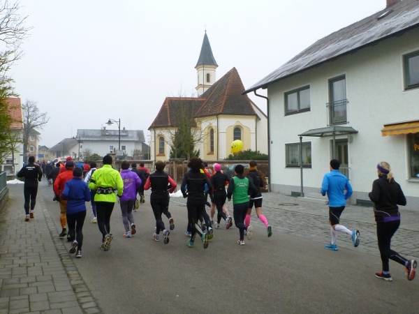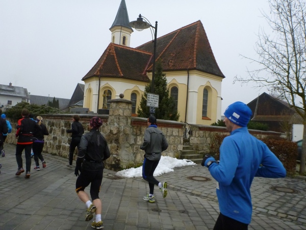 Mit einem Böllerschuss werden wir auf die Strecke gehaut. Es ist zwar jetzt das Feld eng beieinander, doch nach ein, zwei Kilometer wird sich das entzerren. Nach rund 200 Metern laufen wir in einen Kreisverkehr und es geht in den Ortsteil Safferstetten. Der 3.30er Zugläufer geht vorbei. Ich lasse ihn ziehen, es ist mir einen Tick zu schnell.