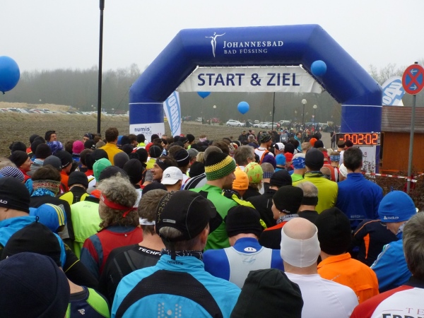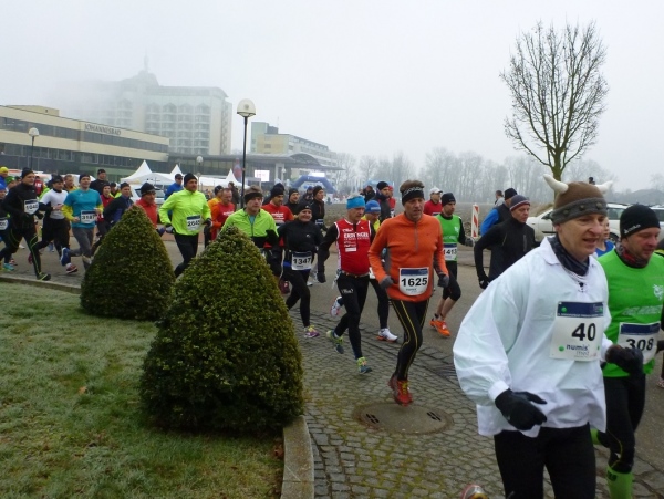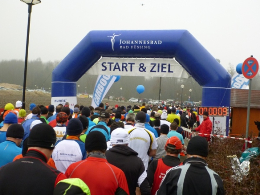 Perfekt ist das Drumherum im Johannesbad: Du bekommst einen Chip gegen Abgabe des Badegutscheins, kannst deine Klamotten in einen Spind einsperren, wartest bis kurz vor dem Start, gehst raus und brauchst nur noch laufen. Nach dem Zieleinlauf bist du in wenigen Augenblicken im Warmen, außer man hält sich im Verpflegungszelt länger auf.