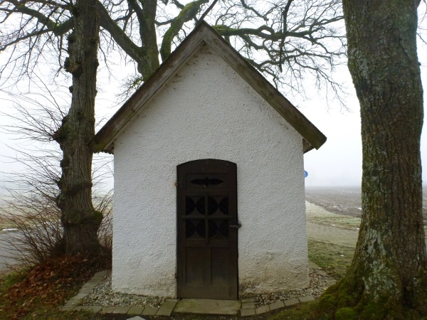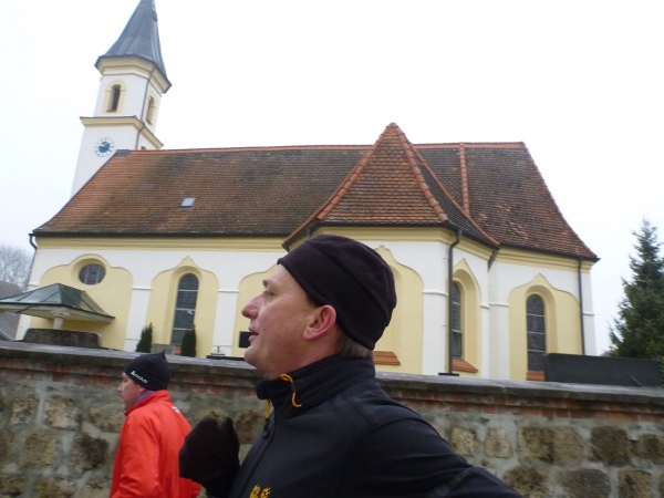 An einer Kapelle biegen wir links ab. Ich steuere jedoch auf das kleine Gotteshaus zu, vielleicht kann ich da ein Bild schießen. Ein Helfer beobachtet mich und lässt mich mit seinem lauten „Holt“ aufschauen. „Do geht’s lang“, deutet in Laufrichtung. Früher sind wir hier nach rechts in Richtung Golfplatz abgebogen.