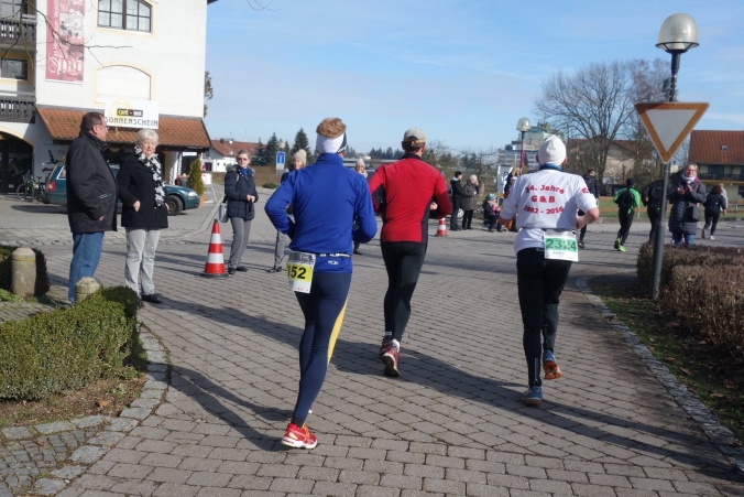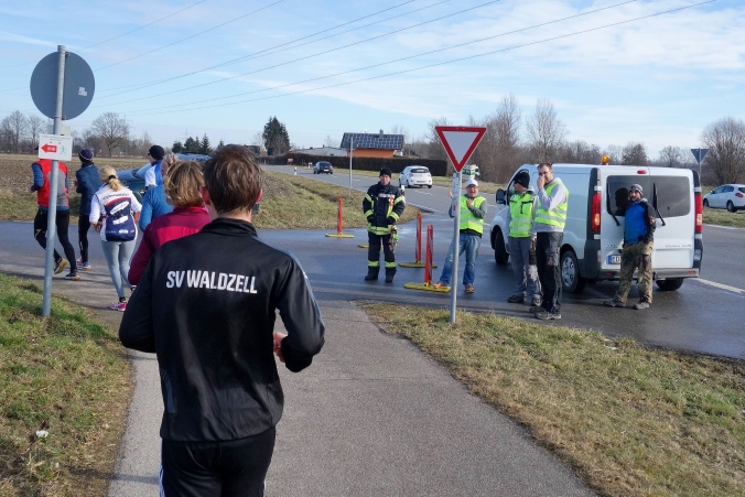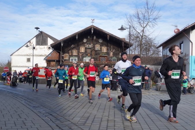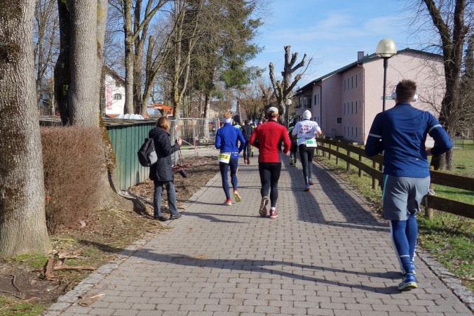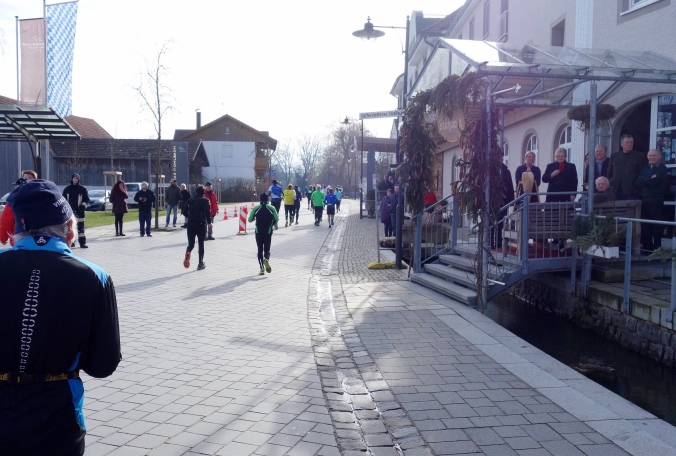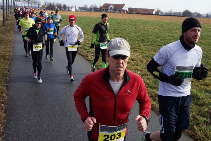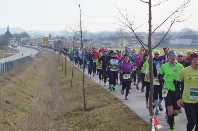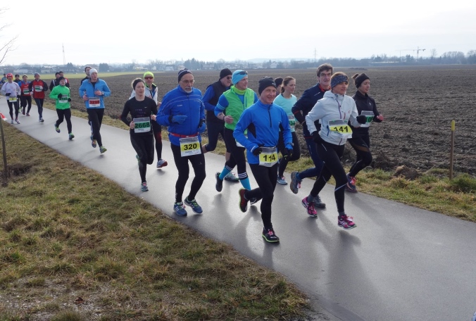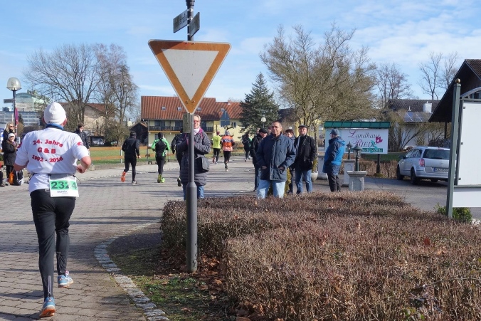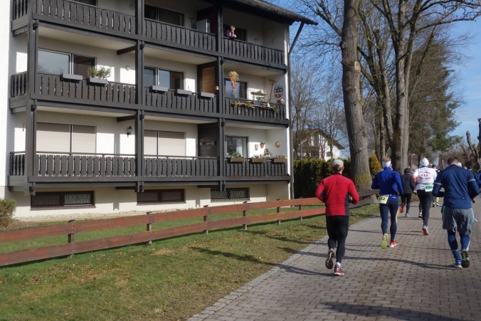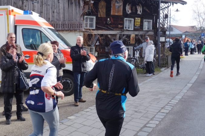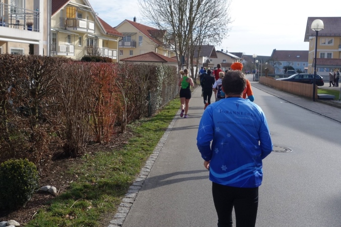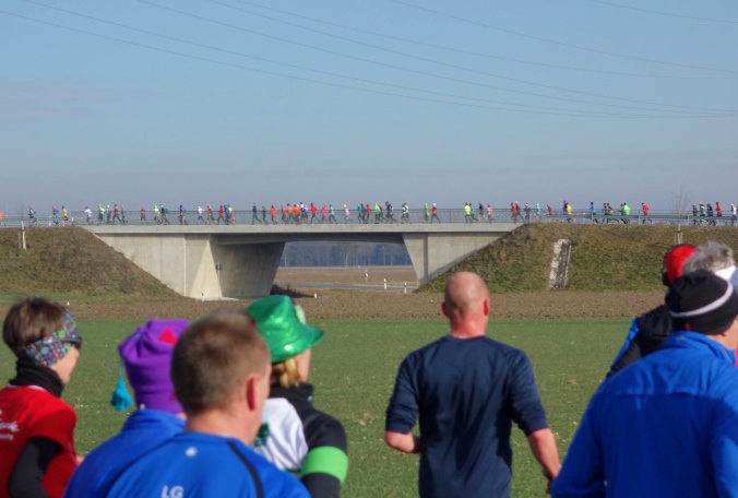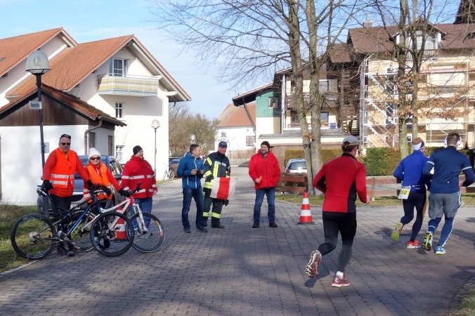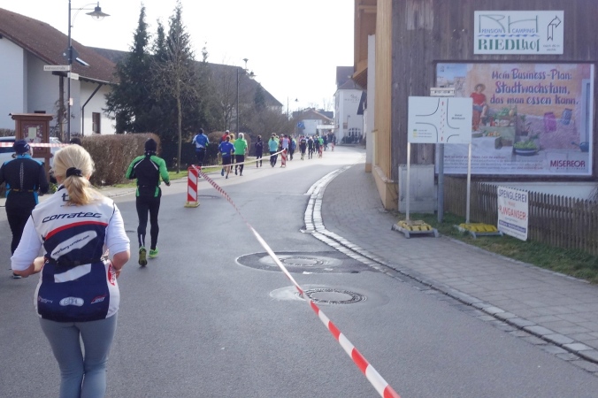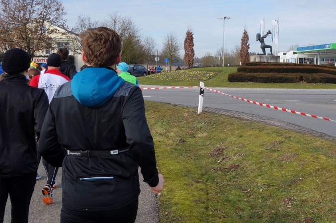 Kurze Zeit später, um 10 Uhr, geht es für die Marathonis und Halbmarathonis los. Vor uns der Kurpark, bei dem wir uns nach rechts an einer Handvoll Hochhäusern vorbei Richtung Würding wenden. Von den oberen Stockwerken der Häuser hat man sicher einen schönen Blick über die Ebene, den Inn und die Alpen. Zweimal werden wir nun die Ortsumgehungsstraße überqueren. Eins sei schon verraten: Wir werden viele Dörfer der Gemeinde Bad Füssing nur tangieren. So bleibt uns auch in Würding der Dorfkern verborgen. Am Schusterpoint die ersten Feuerwehrler, die unseren Laufweg sichern. Die sind indirekt auch „schuld“ daran, dass alle acht Jahre der Marathon erst am zweiten Februarwochenende stattfindet. Dann ist nämlich am ersten Wochenende Fasching und die Männer der Feuerwehr werden auf den entsprechenden Veranstaltungen dringender gebraucht.