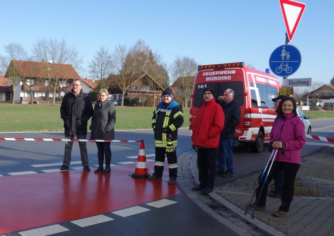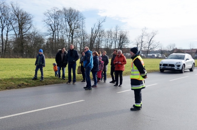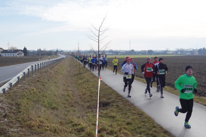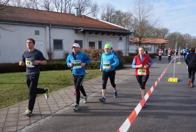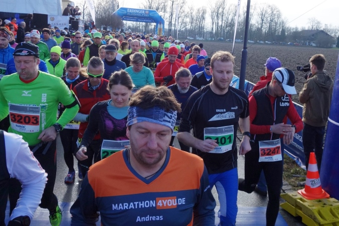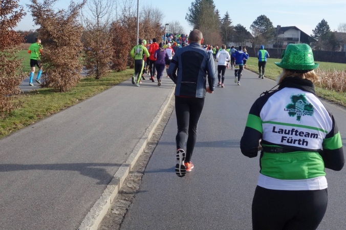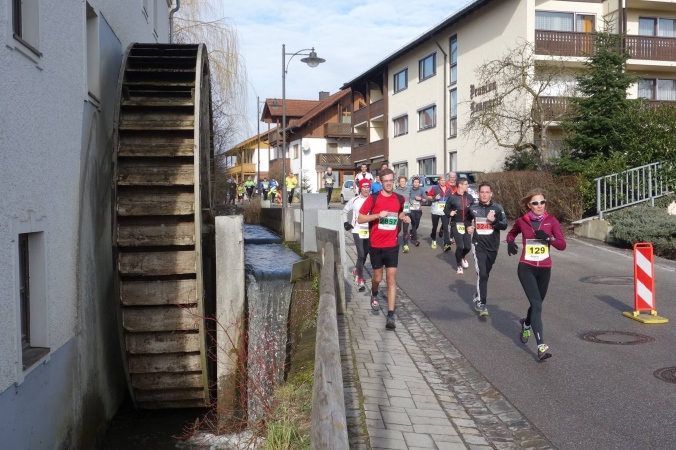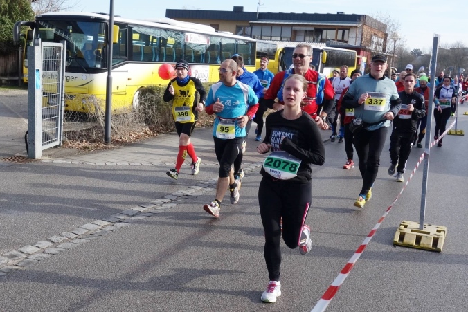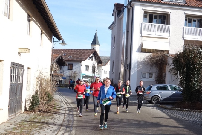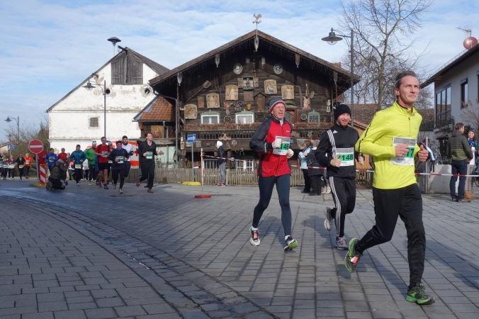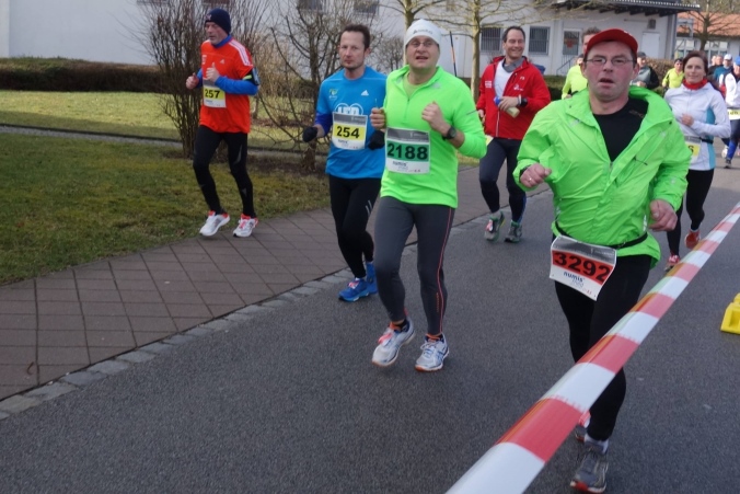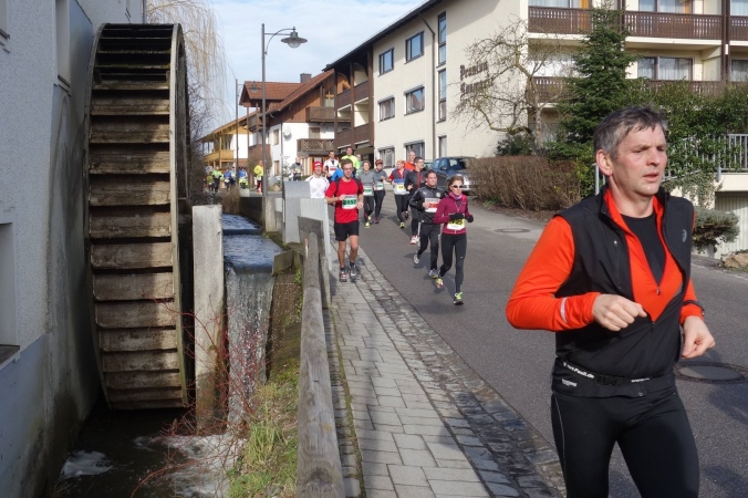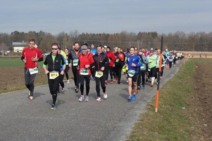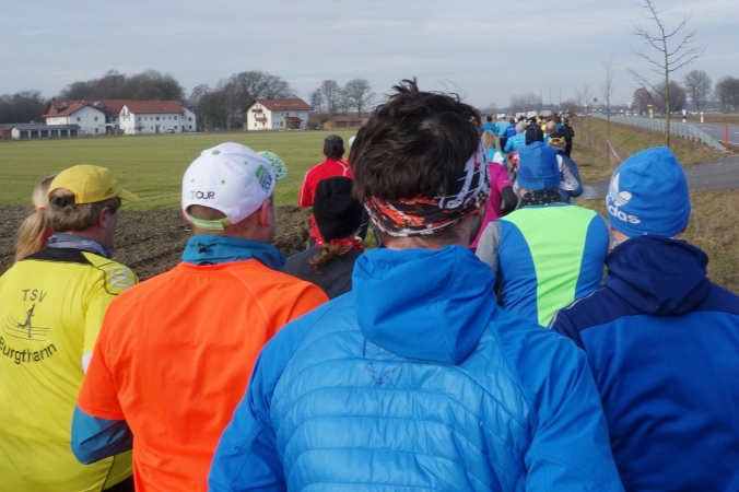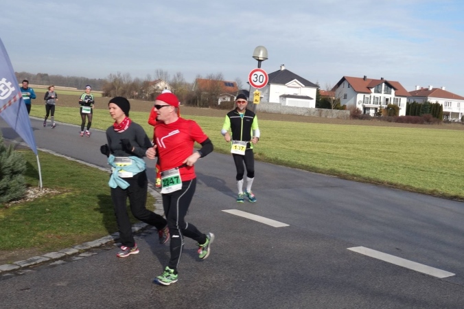 Kurze Zeit später, um 10 Uhr, geht es für die Marathonis und Halbmarathonis los. Vor uns der Kurpark, bei dem wir uns nach rechts an einer Handvoll Hochhäusern vorbei Richtung Würding wenden. Von den oberen Stockwerken der Häuser hat man sicher einen schönen Blick über die Ebene, den Inn und die Alpen. Zweimal werden wir nun die Ortsumgehungsstraße überqueren. Eins sei schon verraten: Wir werden viele Dörfer der Gemeinde Bad Füssing nur tangieren. So bleibt uns auch in Würding der Dorfkern verborgen. Am Schusterpoint die ersten Feuerwehrler, die unseren Laufweg sichern. Die sind indirekt auch „schuld“ daran, dass alle acht Jahre der Marathon erst am zweiten Februarwochenende stattfindet. Dann ist nämlich am ersten Wochenende Fasching und die Männer der Feuerwehr werden auf den entsprechenden Veranstaltungen dringender gebraucht.