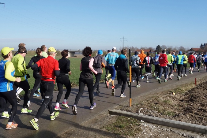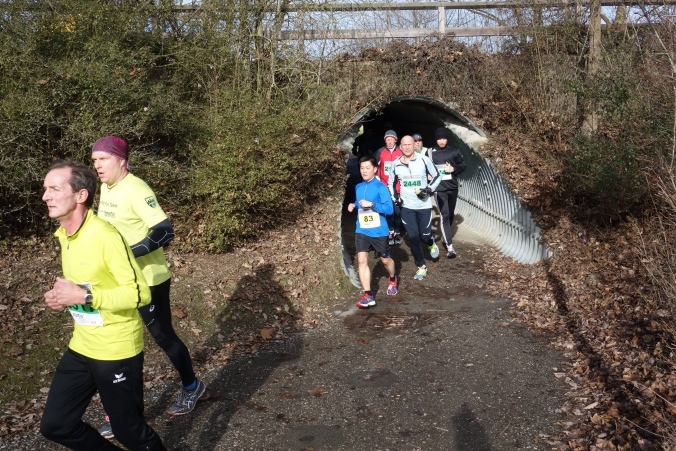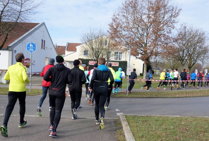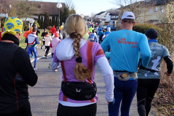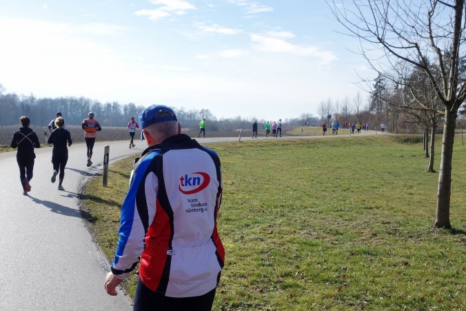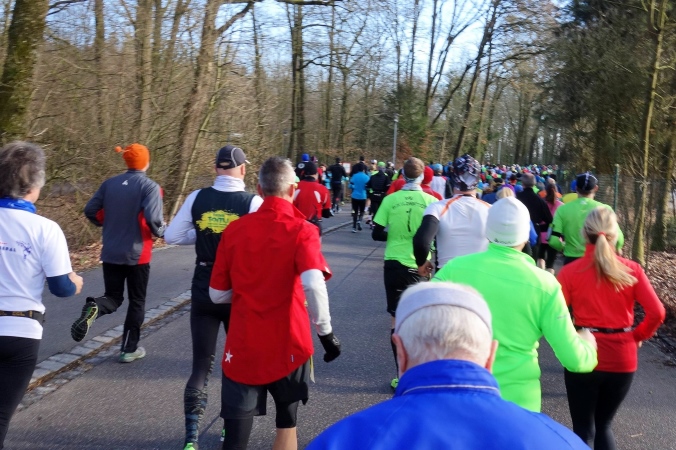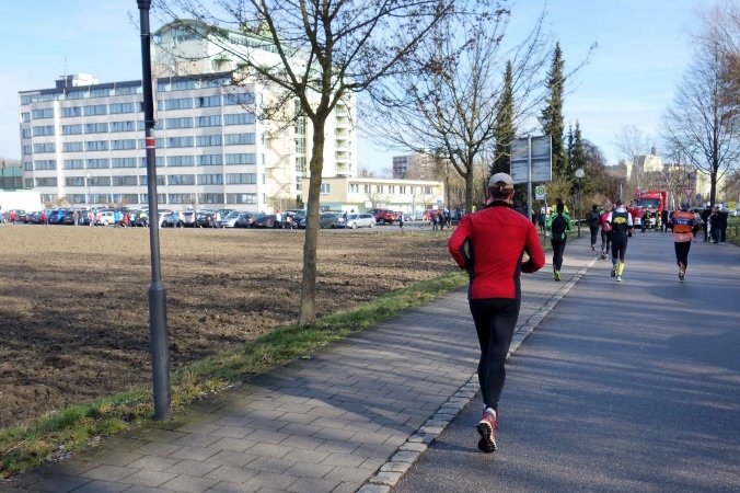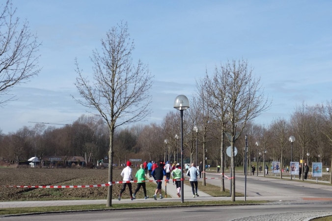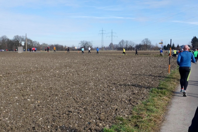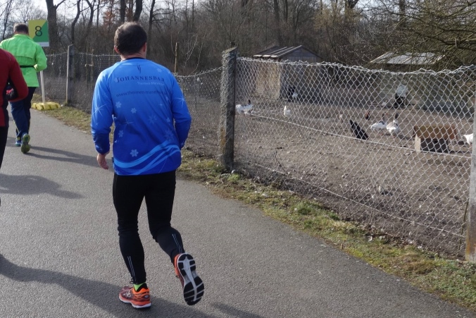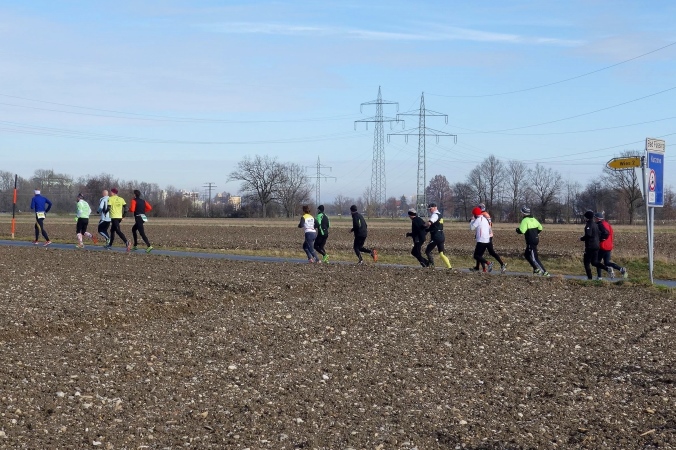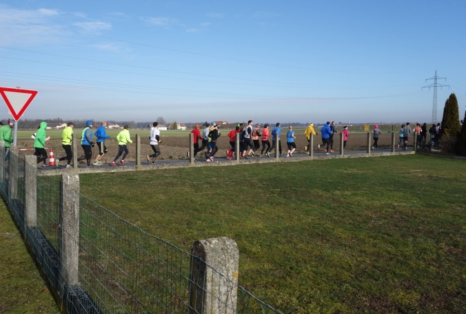 Weiter auf den Tränkeweg, der sich zu einer schnellen Landstraße mit breitem Rad- und Fußweg gemausert hat. Schöne Ausblicke ergeben sich auf die lange Reihe der Läuferinnen und Läufer vor und hinter uns. In dieser Ecke befinden sich auch eine große Tennisanlage und ein Freibad. Schon ist es an der Zeit, die Handschuhe auszuziehen, die sich bis ins Ziel so weit im rückwärtigen Teil meiner Laufhose hinunter arbeiten, dass ich mir wie ein Bunny vorkomme. Dafür gestaltet sich die Bedienung des Fotoapparats einfacher.