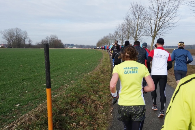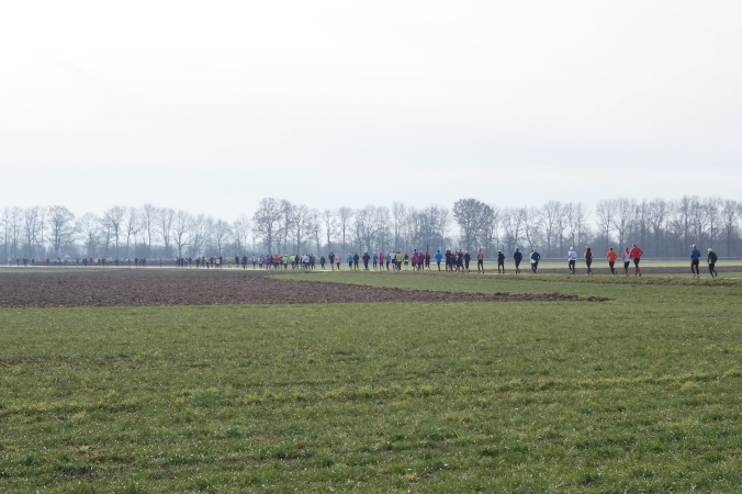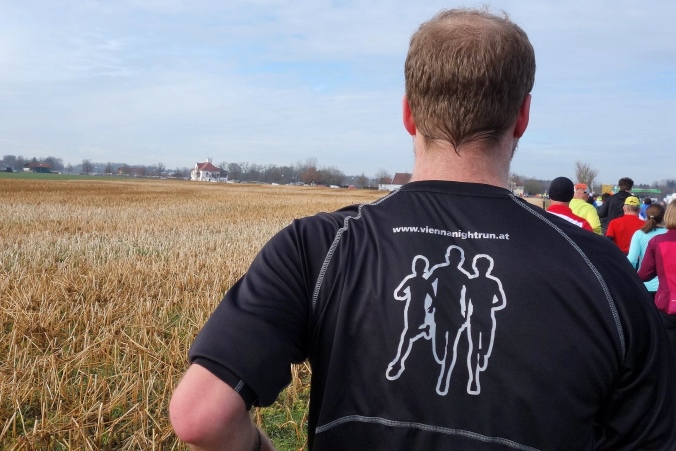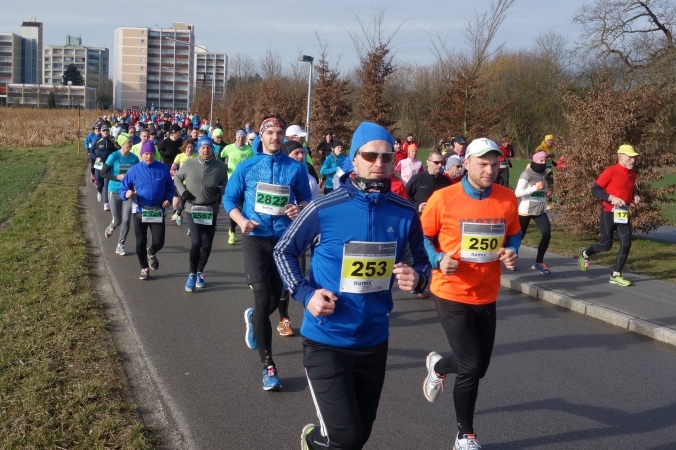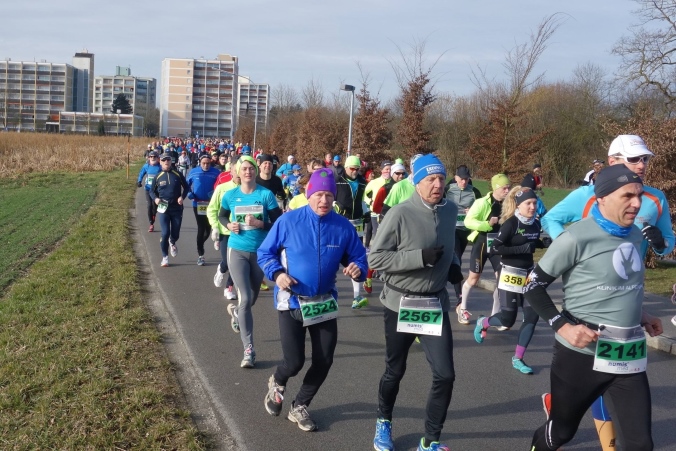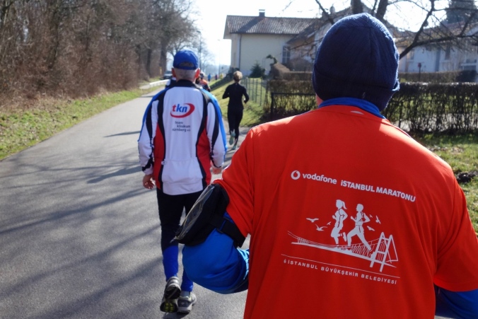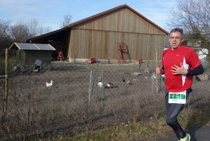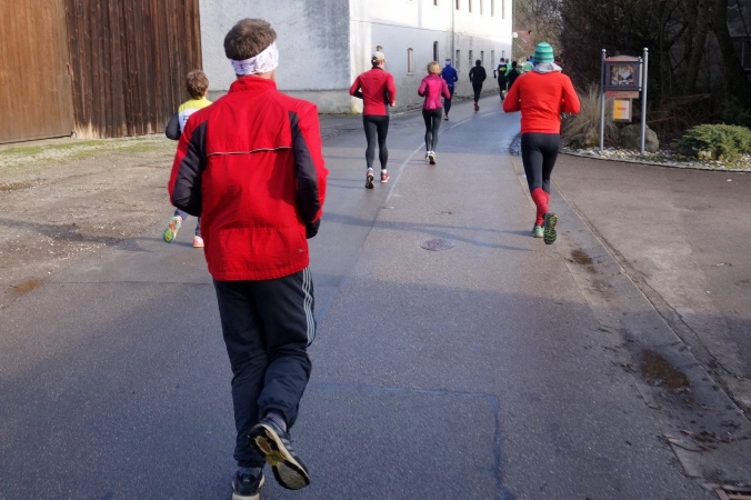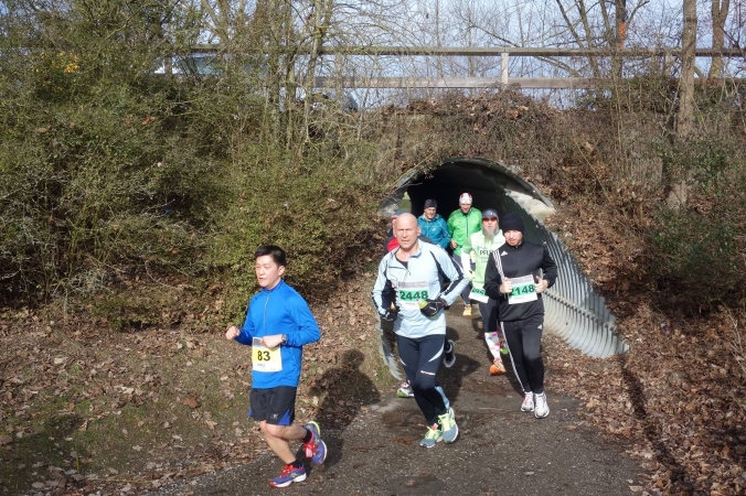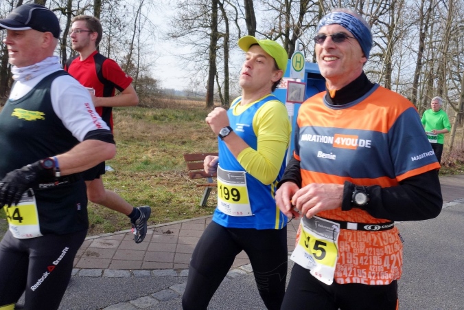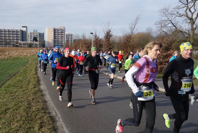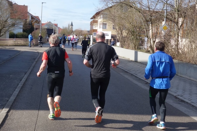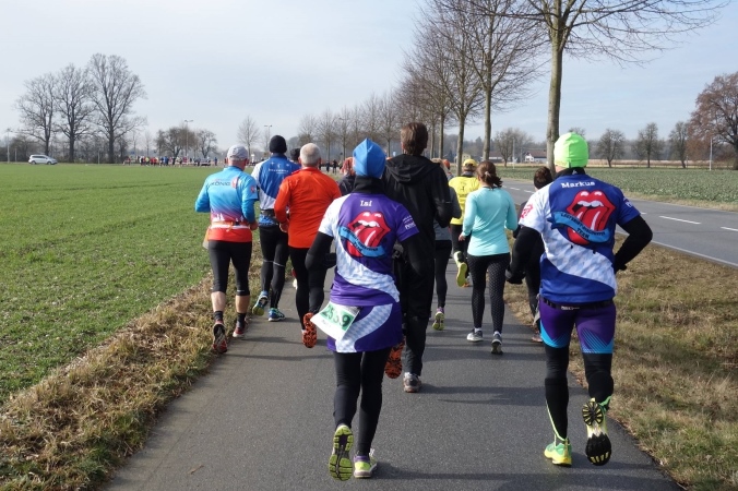 Weiter auf den Tränkeweg, der sich zu einer schnellen Landstraße mit breitem Rad- und Fußweg gemausert hat. Schöne Ausblicke ergeben sich auf die lange Reihe der Läuferinnen und Läufer vor und hinter uns. In dieser Ecke befinden sich auch eine große Tennisanlage und ein Freibad. Schon ist es an der Zeit, die Handschuhe auszuziehen, die sich bis ins Ziel so weit im rückwärtigen Teil meiner Laufhose hinunter arbeiten, dass ich mir wie ein Bunny vorkomme. Dafür gestaltet sich die Bedienung des Fotoapparats einfacher.