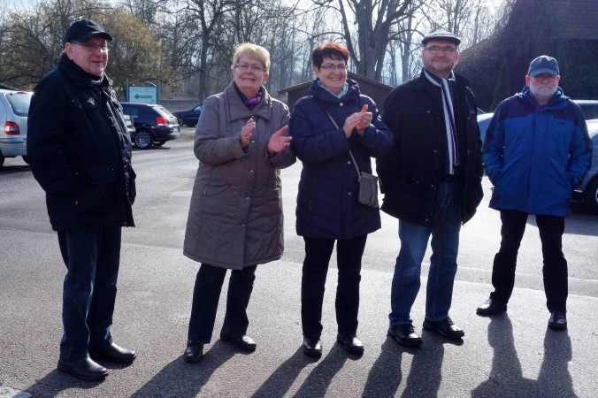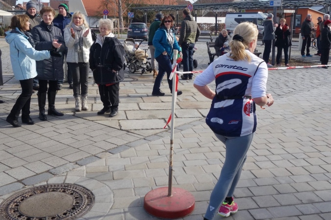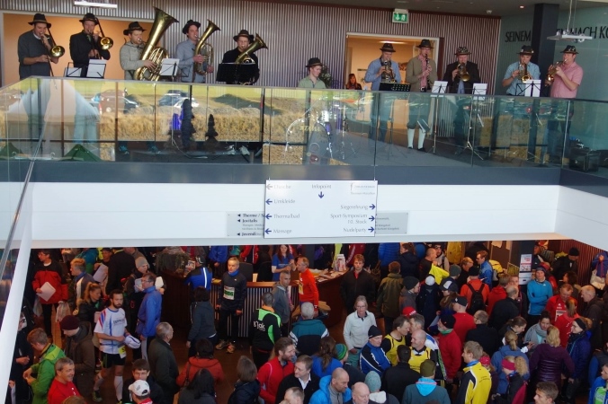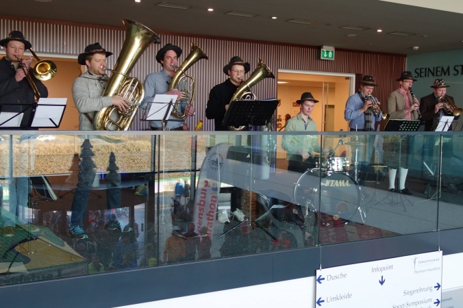 Die Bewerbe beginnen mit dem 10-km-Lauf um 9:45 Uhr vor der Therme. Da wir die weitläufige Umkleideanlage des Bades nutzen können, ersparen wir uns ein langes Frieren vor dem Start. Spannend das morgendliche Zusammentreffen von meist älteren Kurgästen und drahtigen Läufern. Eine betagte Dame berichtet per Handy und in breitem Sächsisch vom bevorstehenden sportlichen Großereignis. Eine Blaskapelle spielt im Foyer für uns auf, wo auch die Marathonmesse stattfindet und der Laufshirt-Discounter, seit neuestem M4Y-Ausrüster, ein spezielles Thermen-Marathon-Laufhemd anbietet. Nachmeldungen werden auch noch angenommen.