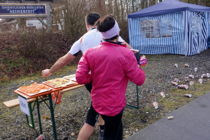 Judith hat sich an Anton Lautner gehängt und ist schon mal weg. Ich versuche mich langsam an Bernie Manhard und seinen Spezl heranzuarbeiten und kann sie am ersten Verpflegungspunkt einholen.