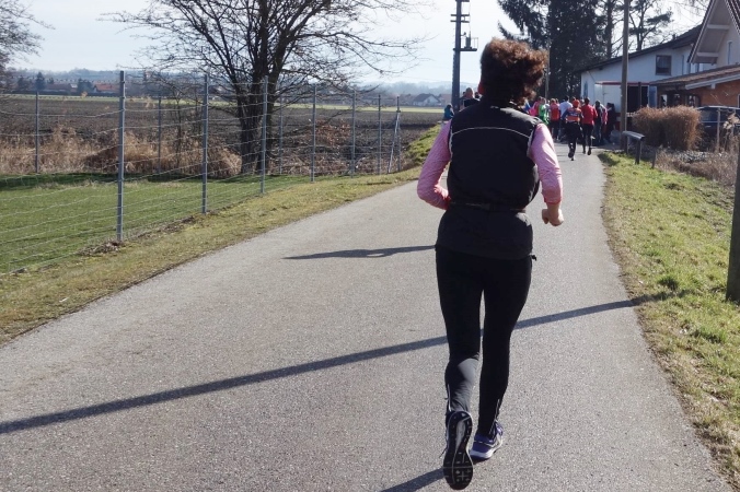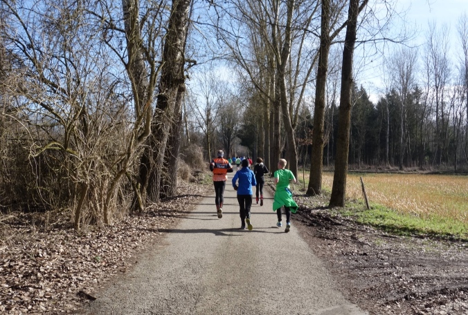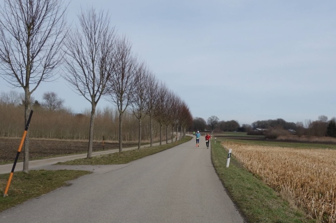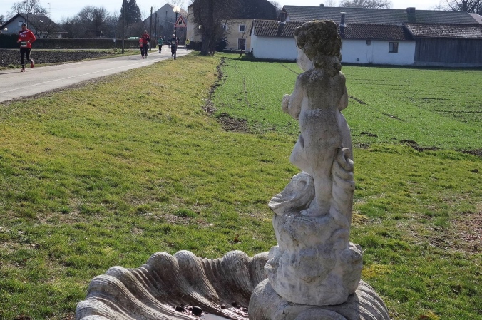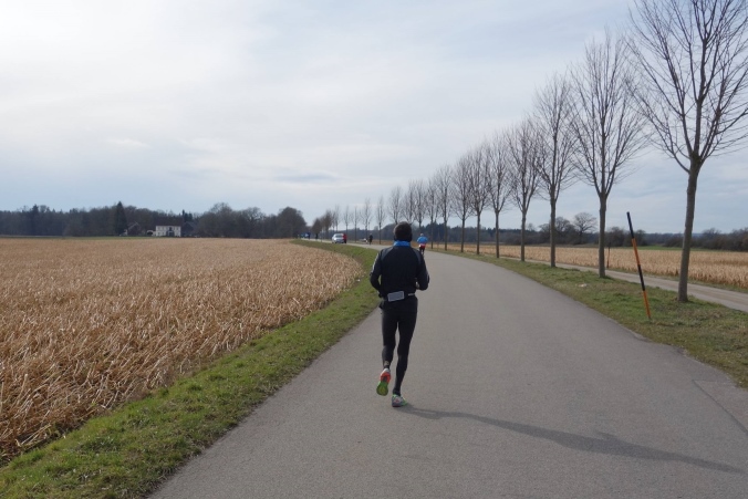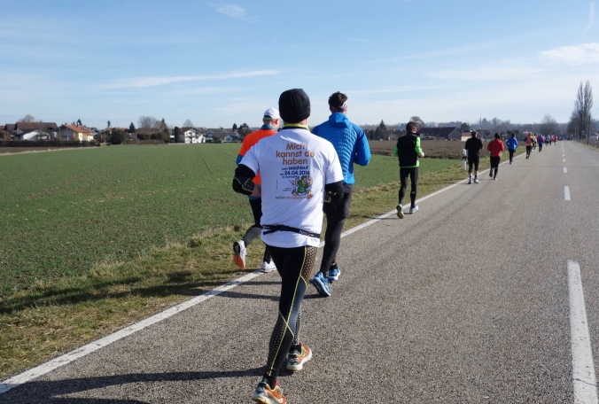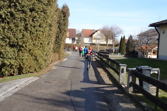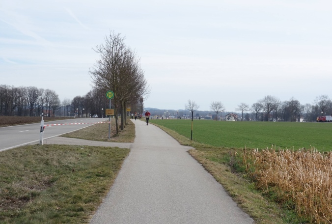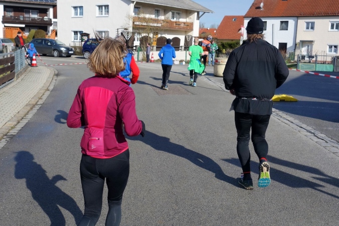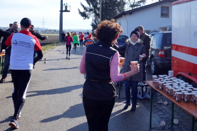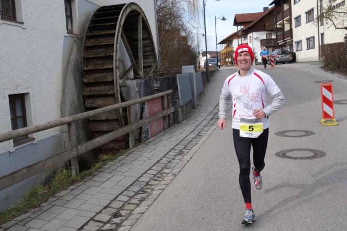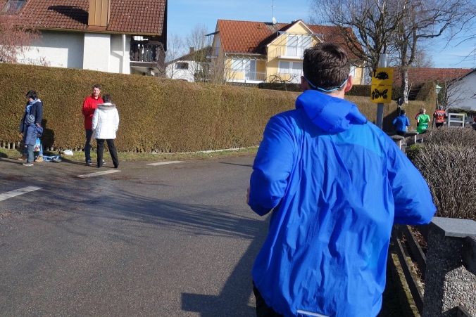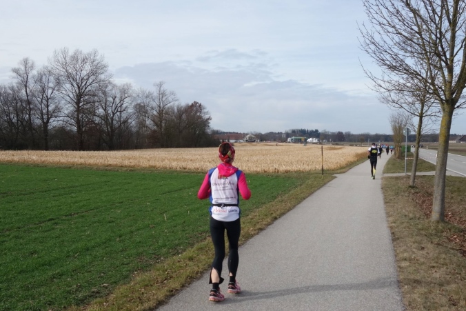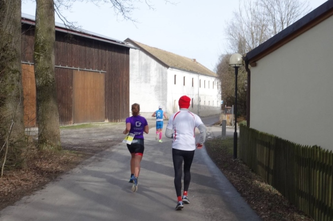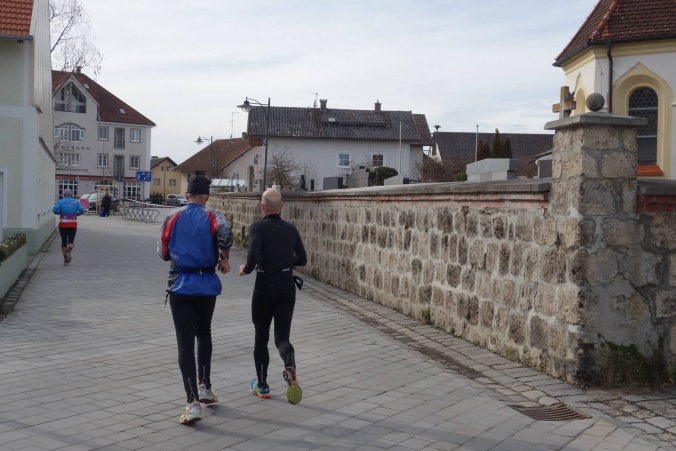 Ein kleiner Weiher schimmert durch die blattlosen Baumstämme. Viele Nadelbäume sehen wir heute nicht. An einer Kapelle vorbei, von deren Sorte es hier etliche gibt. Vor der nächsten Häusergruppe die Verpflegungsstelle bei km 15. Da ist richtig Stimmung. Nur den Grill hat man noch nicht angeworfen. Die „Suburbs“ der Gemeinde Egglfing am Inn werden durchlaufen. Schöne Häuschen liegen in der Föhnsonne. Die Einwohner sind wohl gerade alle im Keller – oder womöglich auch auf der Laufstrecke? Irgendwo sehe ich Vater mit Sohnemann hinter dem Haus spielen. Ich nutze die Chance, mich bei den wenigen Anwohnern, die uns zusehen, ausgiebig zu bedanken. Vielleicht werden es dann nächstes Jahr noch mehr.