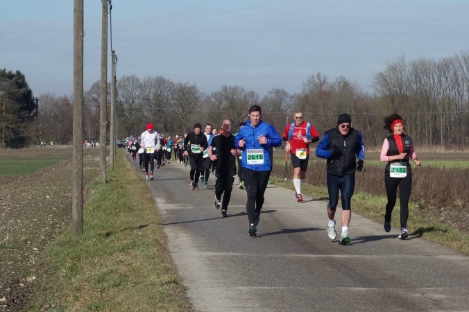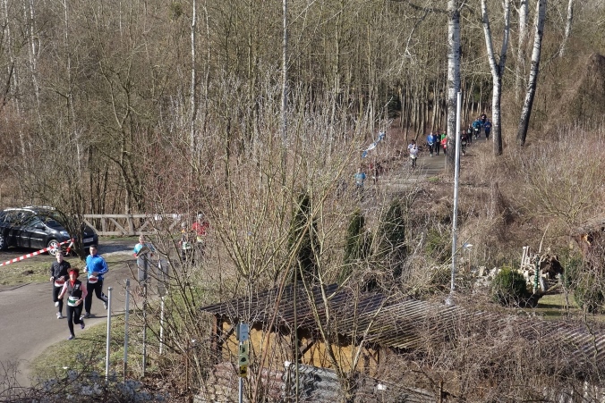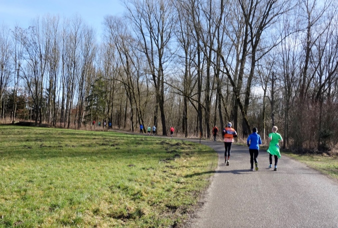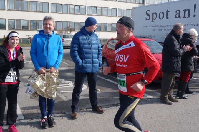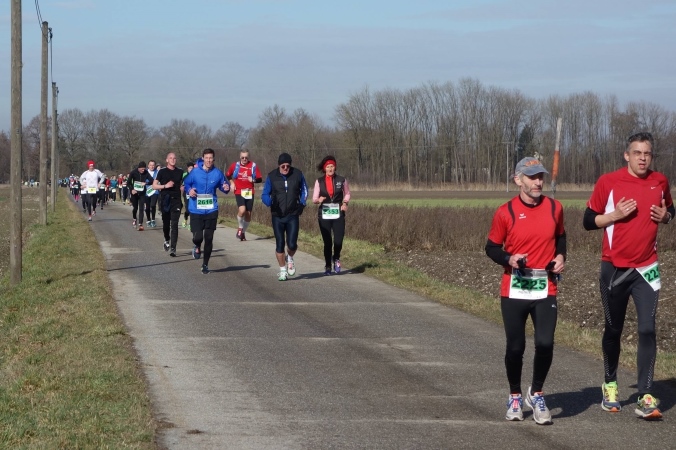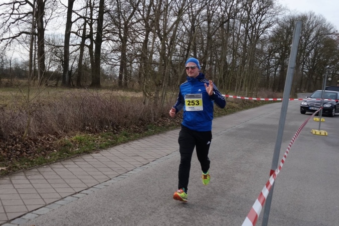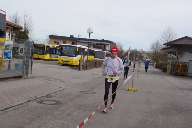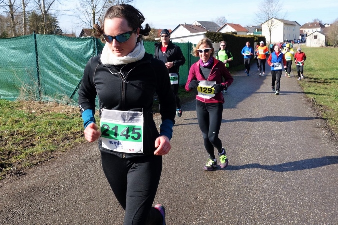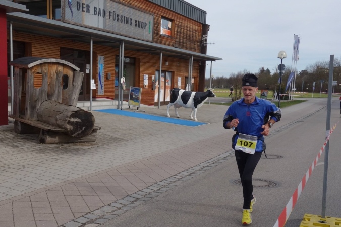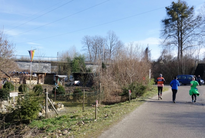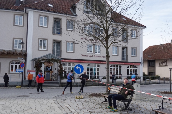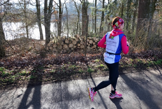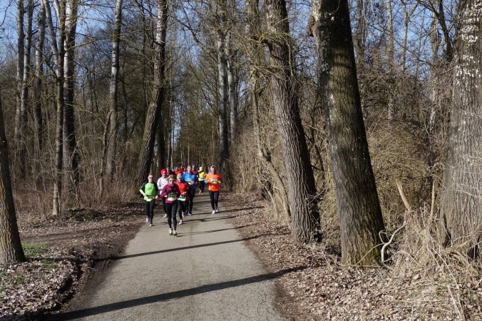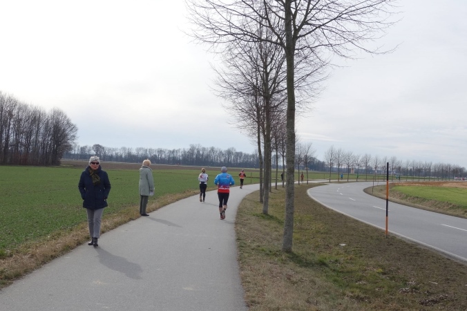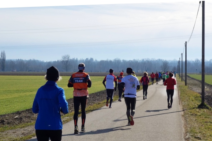 Ein kleiner Weiher schimmert durch die blattlosen Baumstämme. Viele Nadelbäume sehen wir heute nicht. An einer Kapelle vorbei, von deren Sorte es hier etliche gibt. Vor der nächsten Häusergruppe die Verpflegungsstelle bei km 15. Da ist richtig Stimmung. Nur den Grill hat man noch nicht angeworfen. Die „Suburbs“ der Gemeinde Egglfing am Inn werden durchlaufen. Schöne Häuschen liegen in der Föhnsonne. Die Einwohner sind wohl gerade alle im Keller – oder womöglich auch auf der Laufstrecke? Irgendwo sehe ich Vater mit Sohnemann hinter dem Haus spielen. Ich nutze die Chance, mich bei den wenigen Anwohnern, die uns zusehen, ausgiebig zu bedanken. Vielleicht werden es dann nächstes Jahr noch mehr.